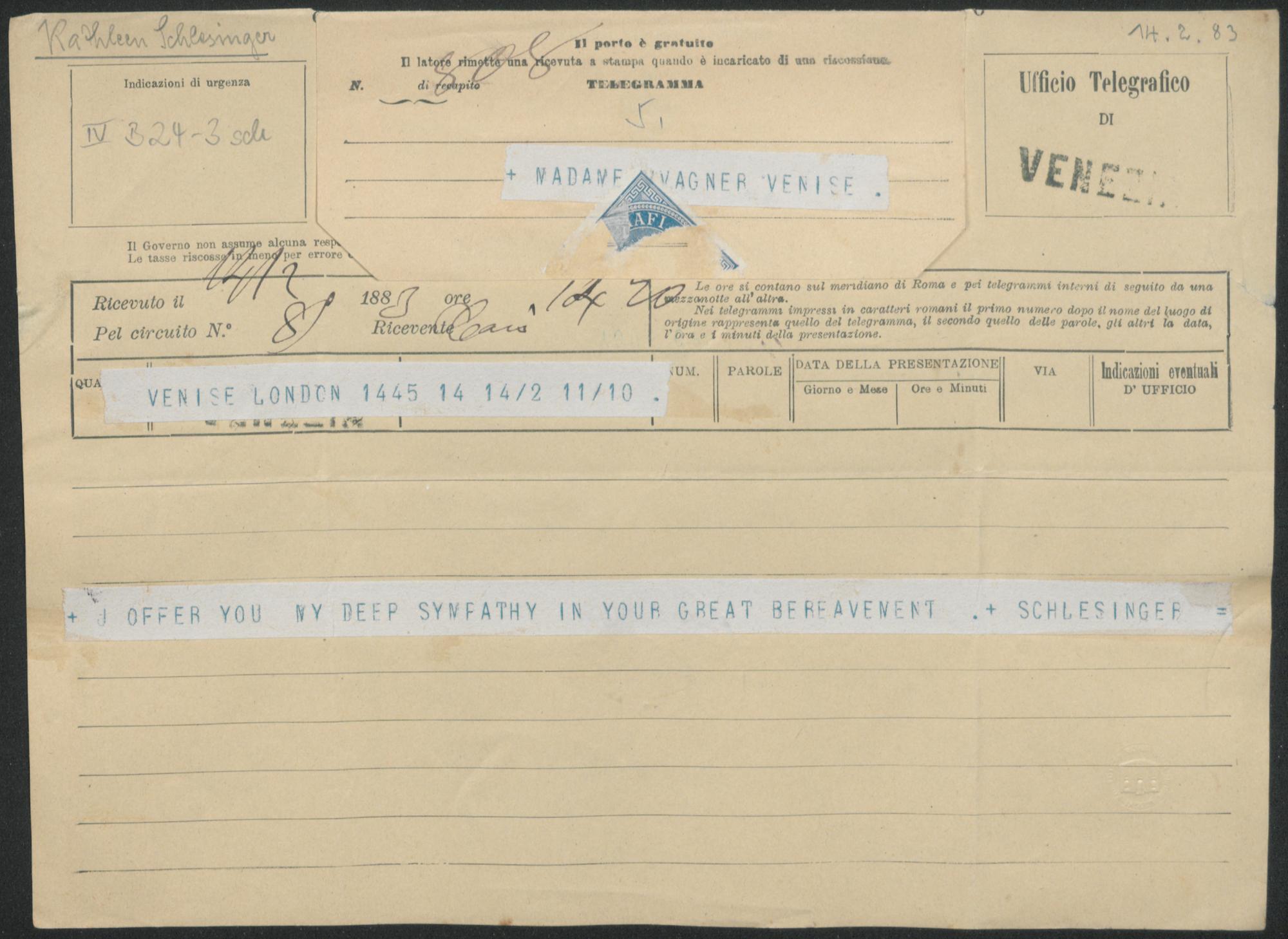 Telegramm von Kathleen Schlesinger an Cosima Wagner