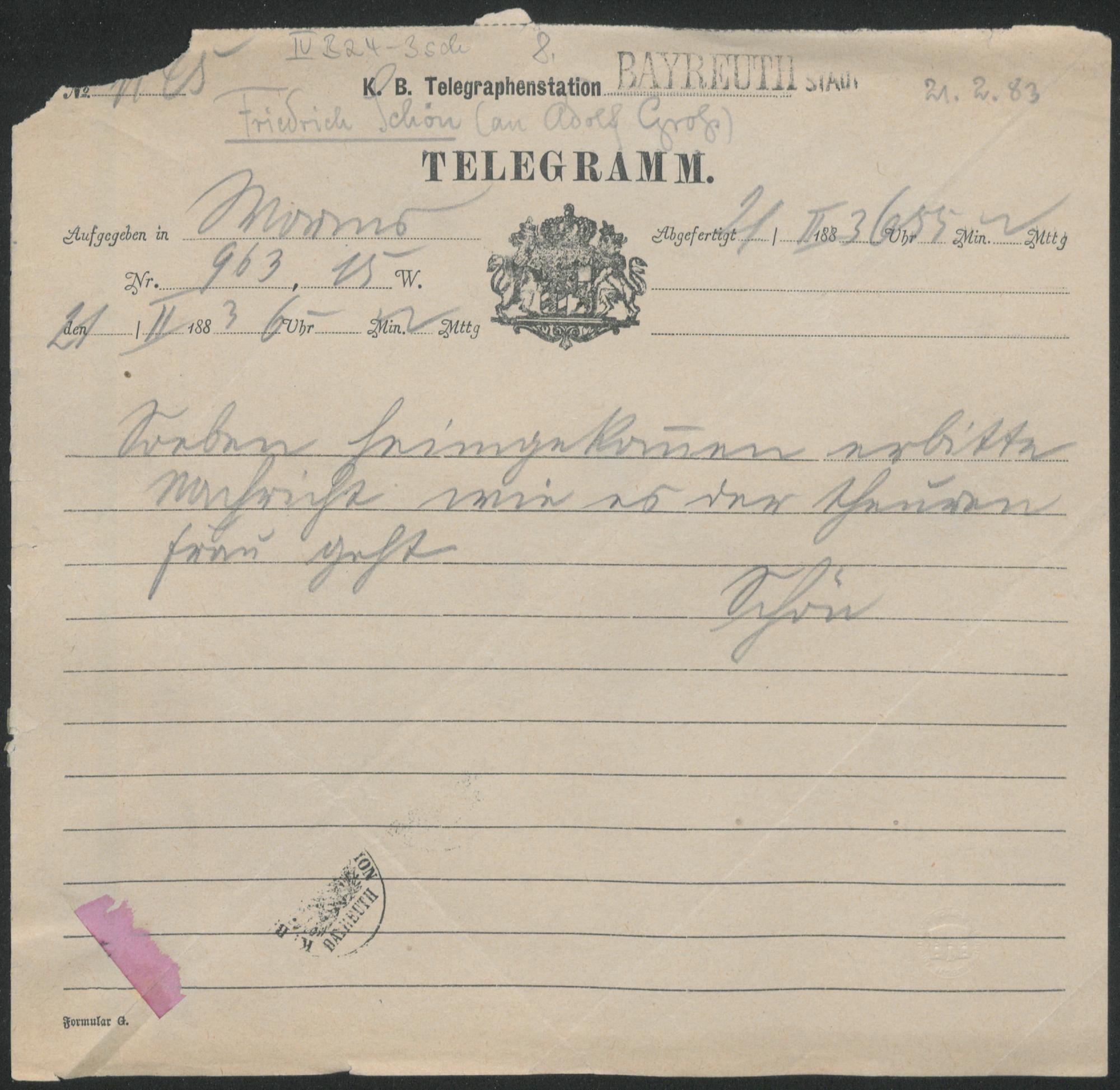 Telegramm von Friedrich von Schoen an Adolf von Gross