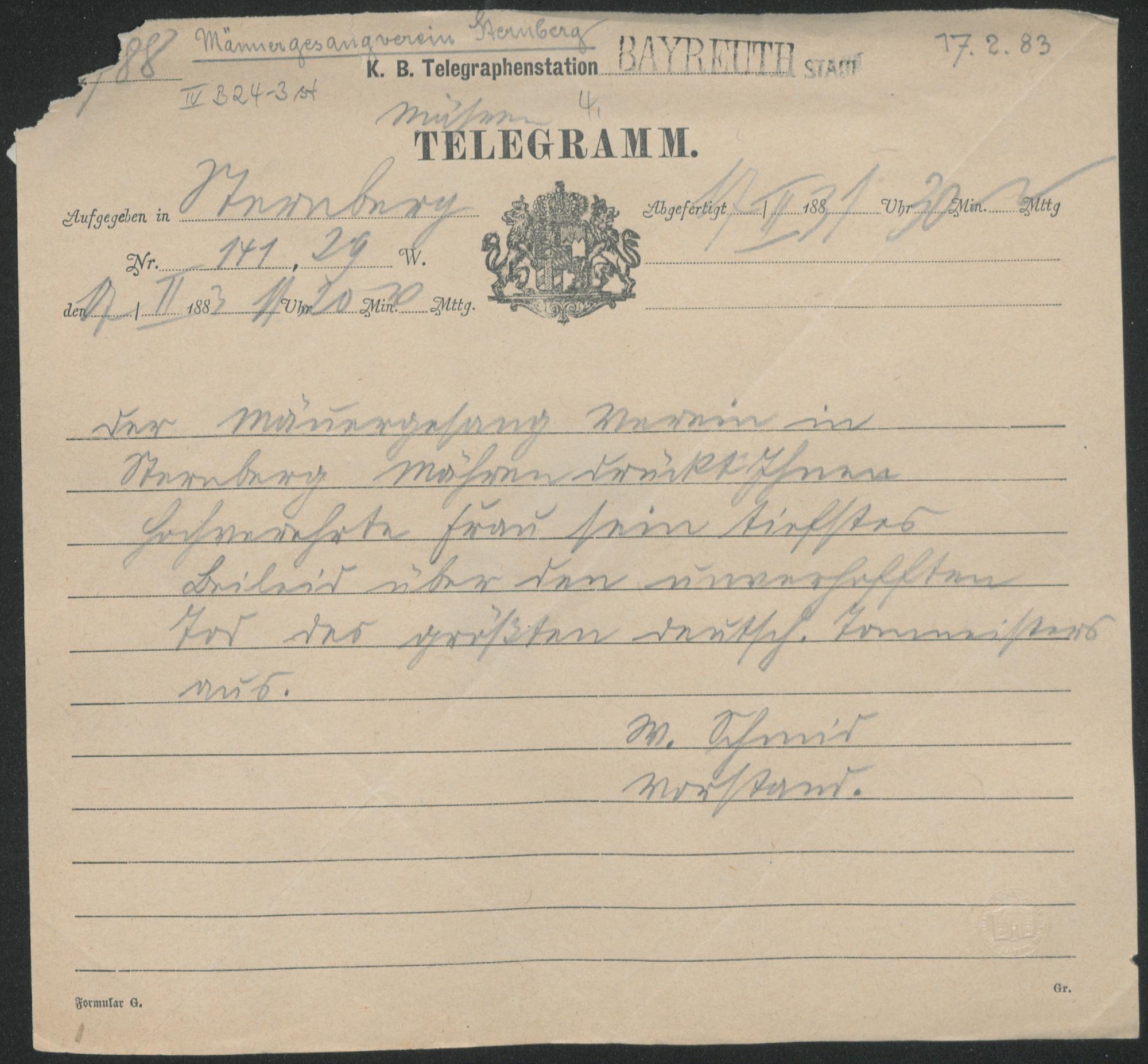 Telegramm vom Männergesangsverein Sternberg (Böhmen) an Cosima Wagner