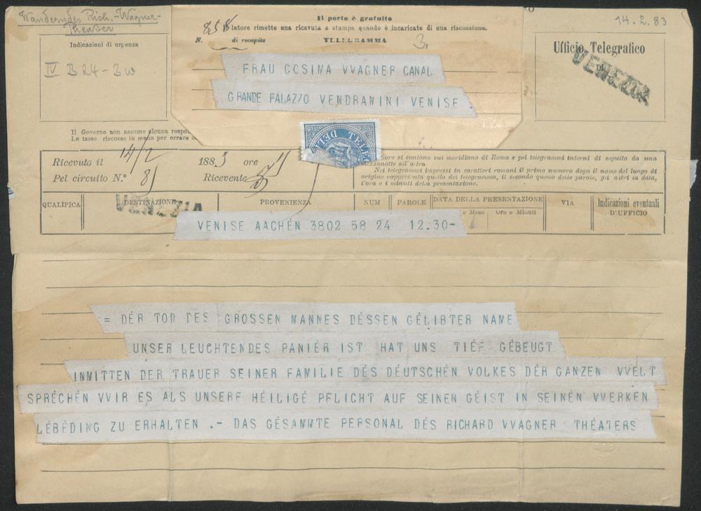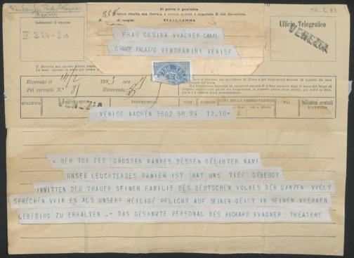 Telegramm vom Personal des Richard-Wagner-Theaters an Cosima Wagner