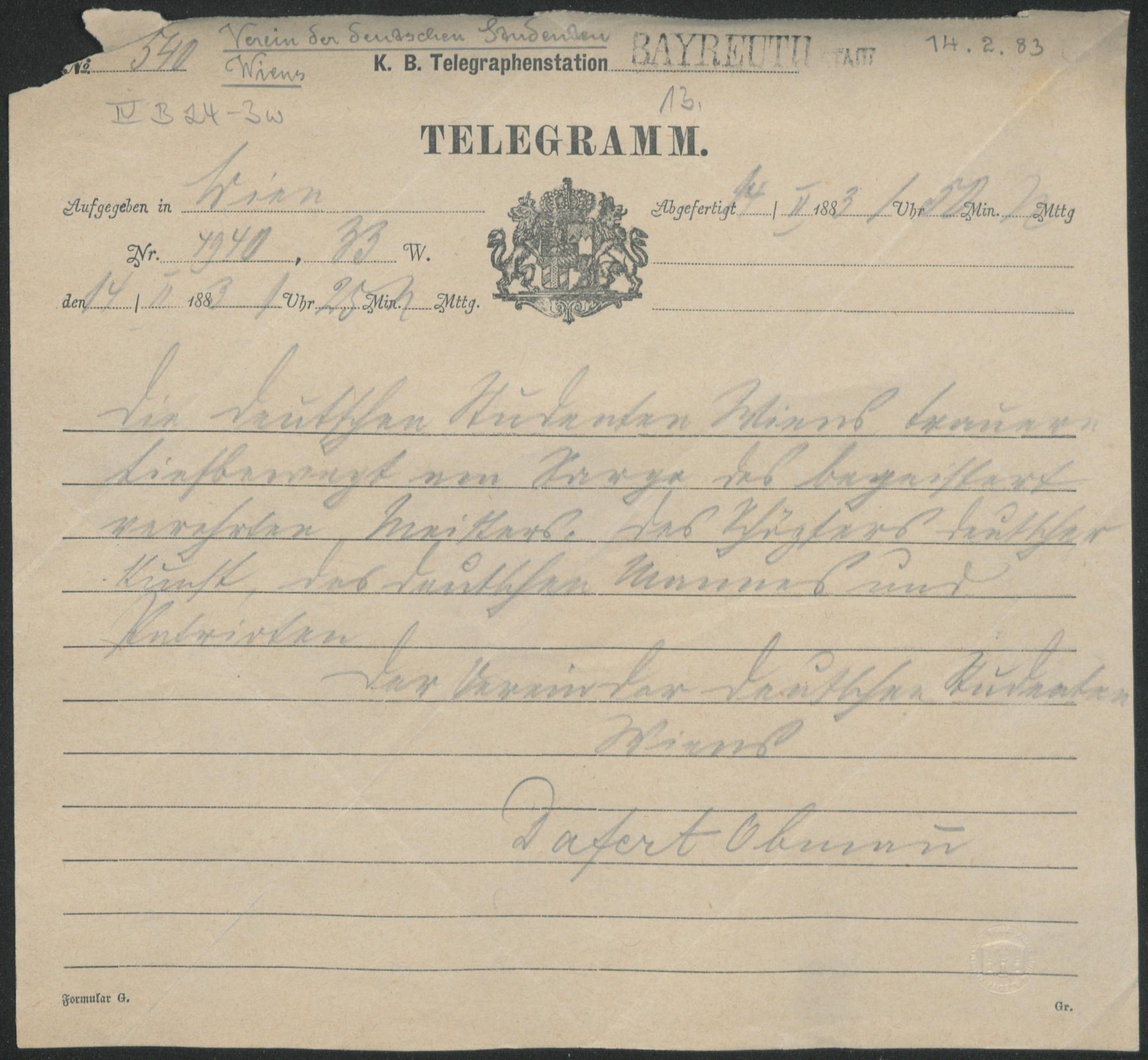 Telegramm vom Verein der deutschen Studenten Wiens an Cosima Wagner