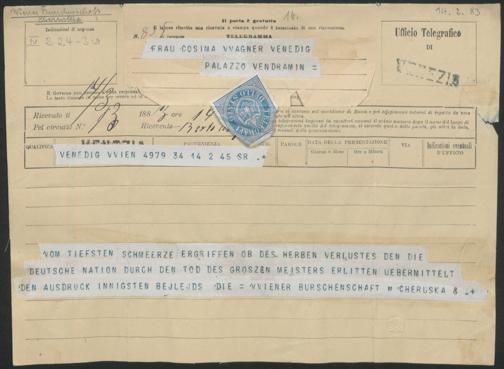 Telegramm von der Wiener Burschenschaft Cheruska an Cosima Wagner