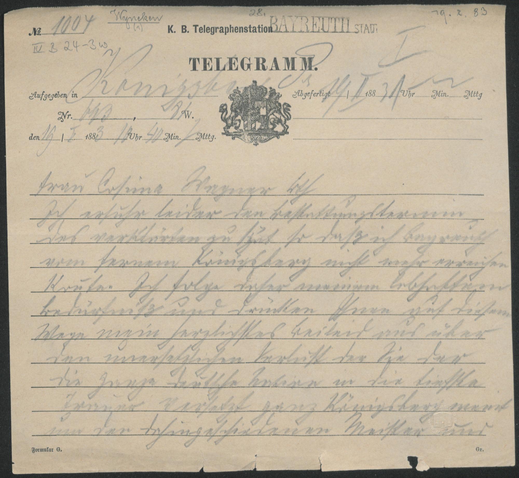 Telegramm von Alexander Wyneken an Cosima Wagner