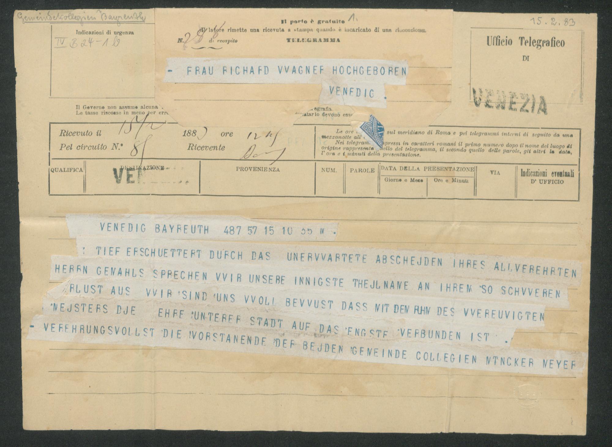 Telegramm von den Gemeinschaftskollegien Bayreuth an Cosima Wagner