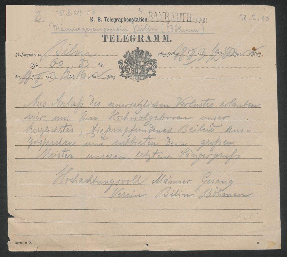 Telegramm vom Männergesangverein Bilin (Böhmen) an Cosima Wagner