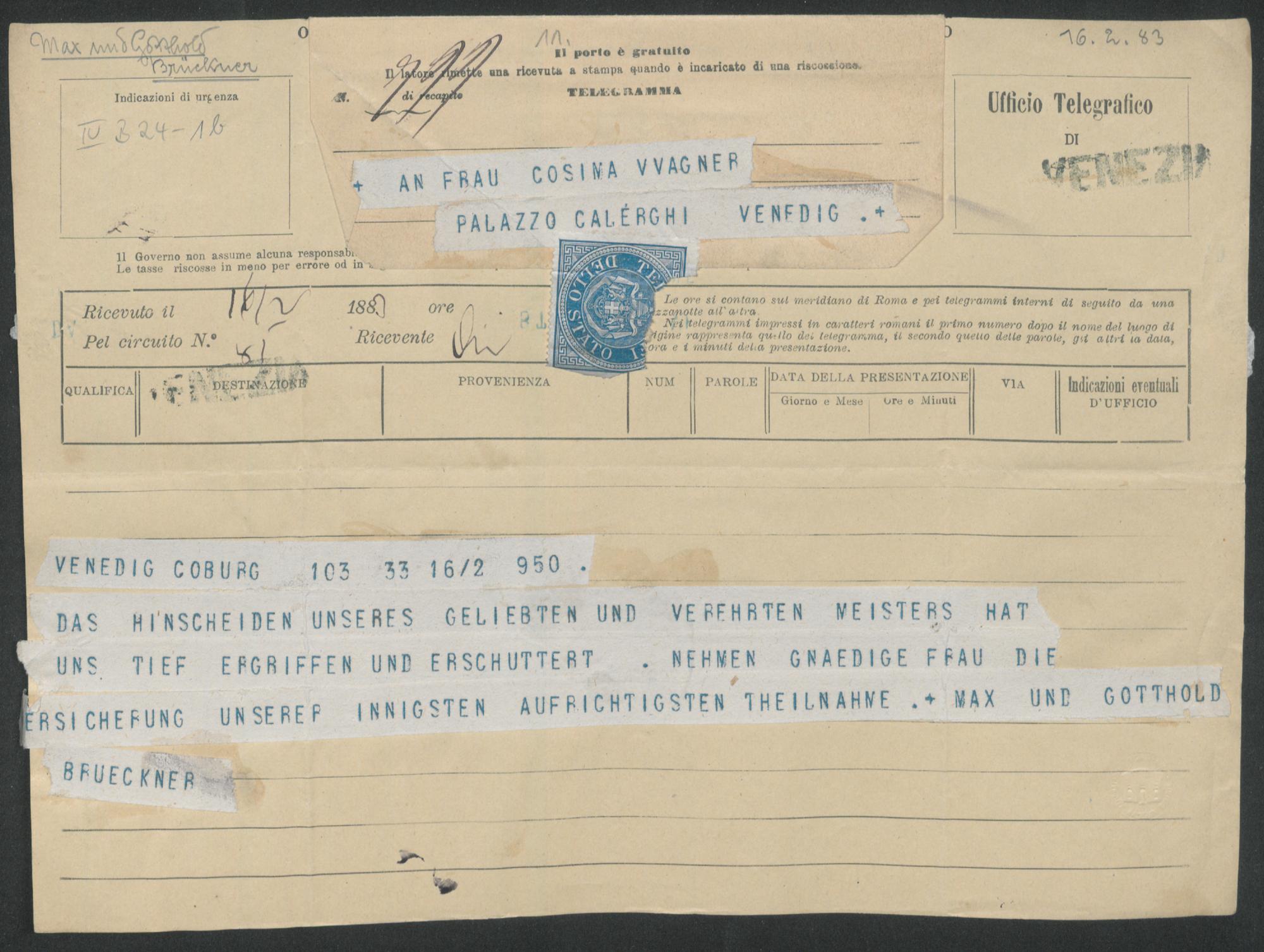 Telegramm von Max und Gotthold Brückner an Cosima Wagner