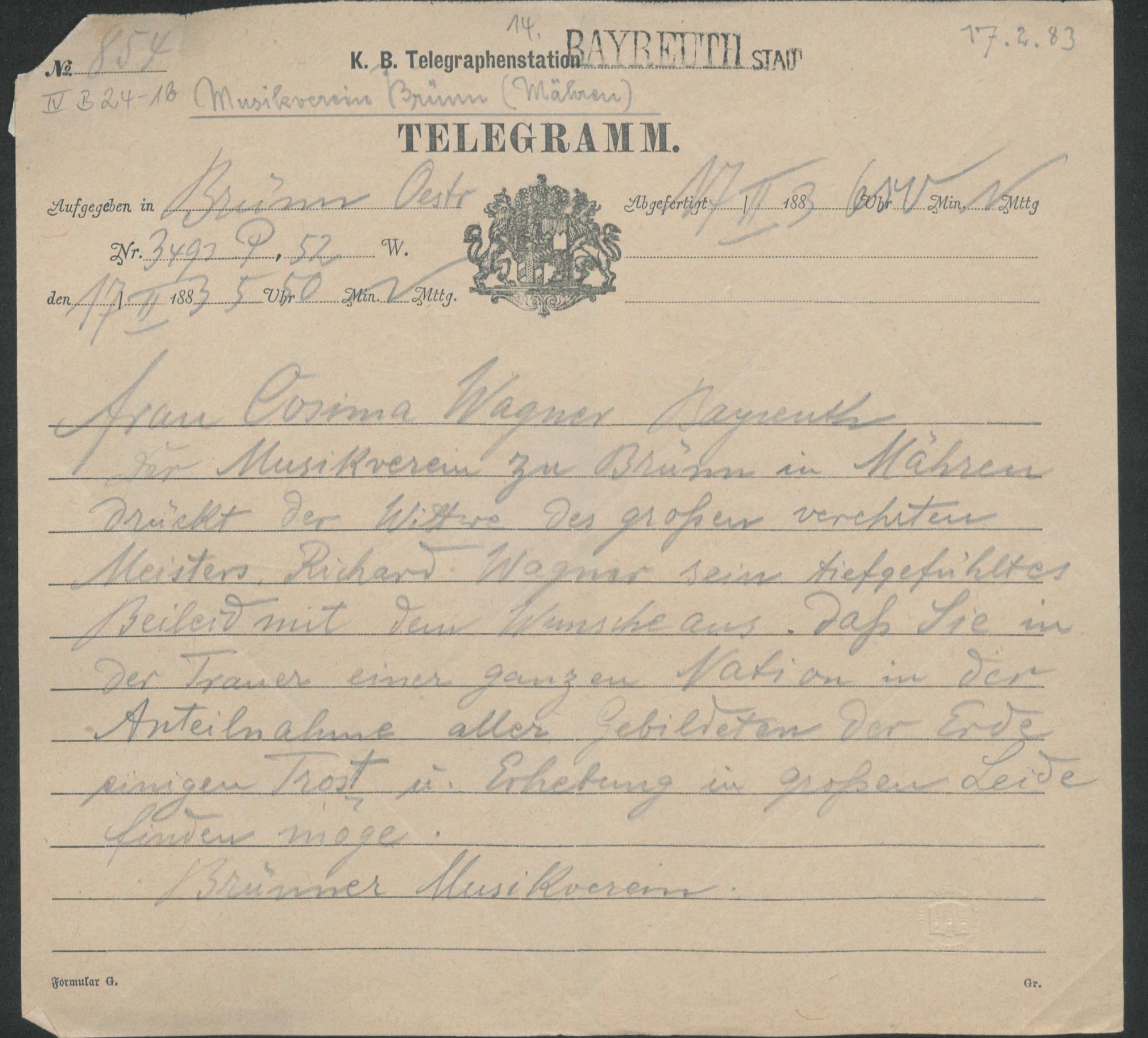 Telegramm vom Brünner Musikverein an Cosima Wagner