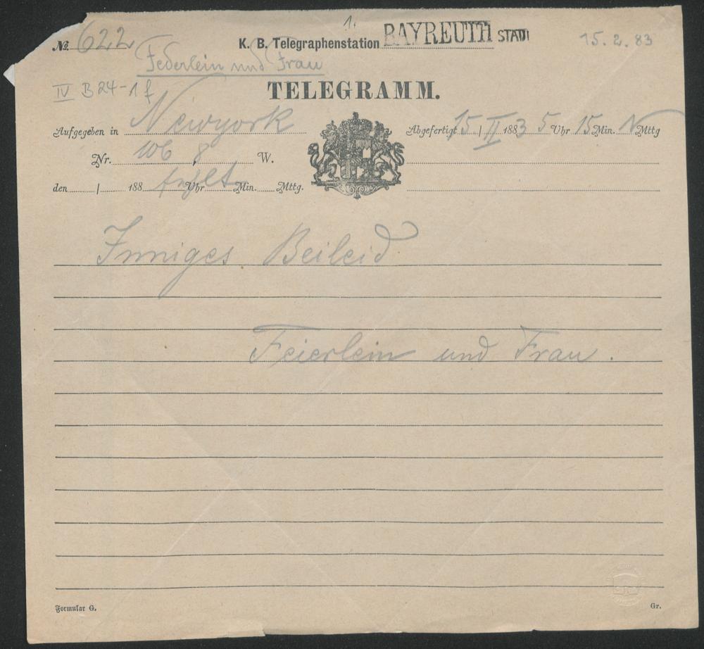 Telegramm von Gottlieb Heinrich Federlein und Unbekannt Federlein an Cosima Wagner