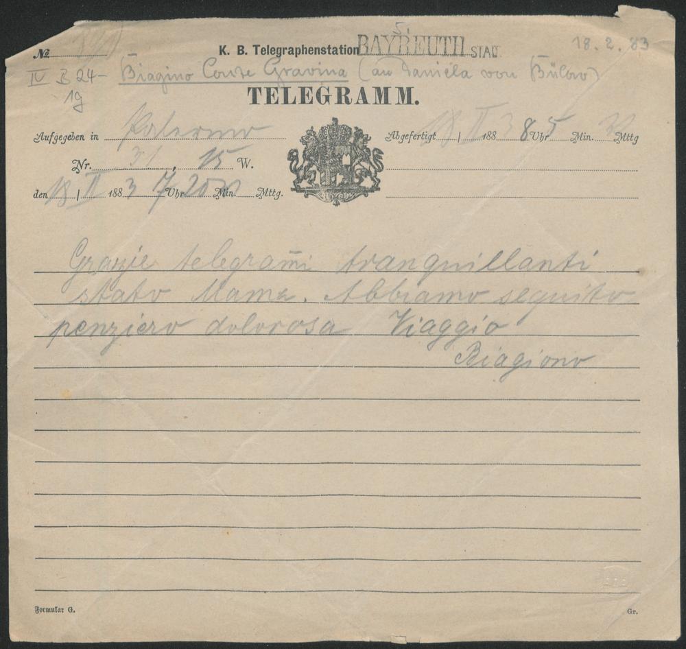 Telegramm von Biagiono Conte Gravina an Daniela von Bülow