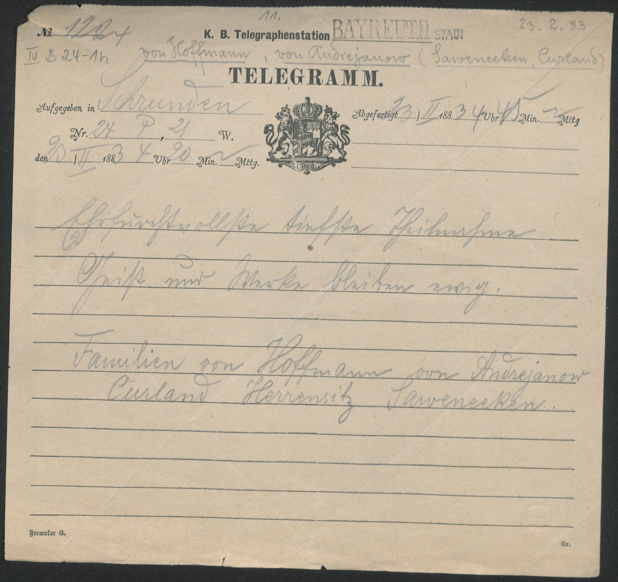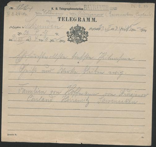 Telegramm von der Familie Hoffmann und von der Familie Andrejanow an Cosima Wagner