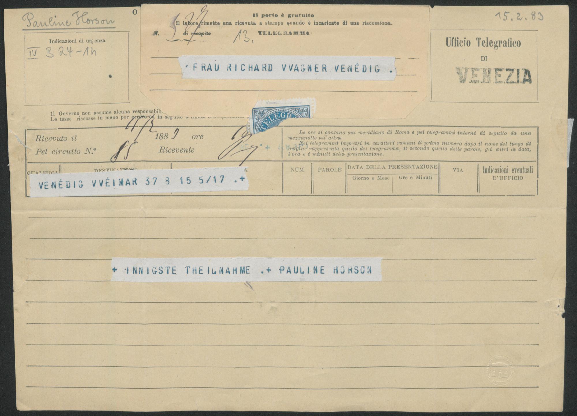 Telegramm von Pauline Horson an Cosima Wagner