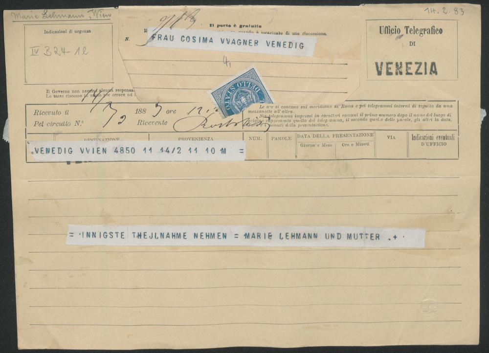 Telegramm von Marie Lehmann und Maria Theresia Lehmann-Löw an Cosima Wagner