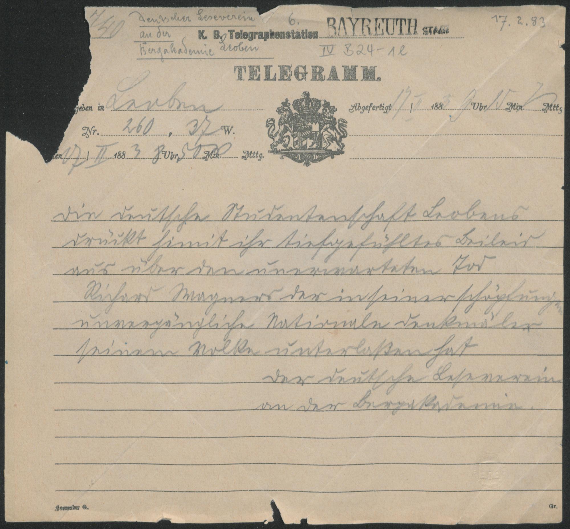 Telegramm vom Deutschen Leseverein an der Bergakademie Leoben an Cosima Wagner