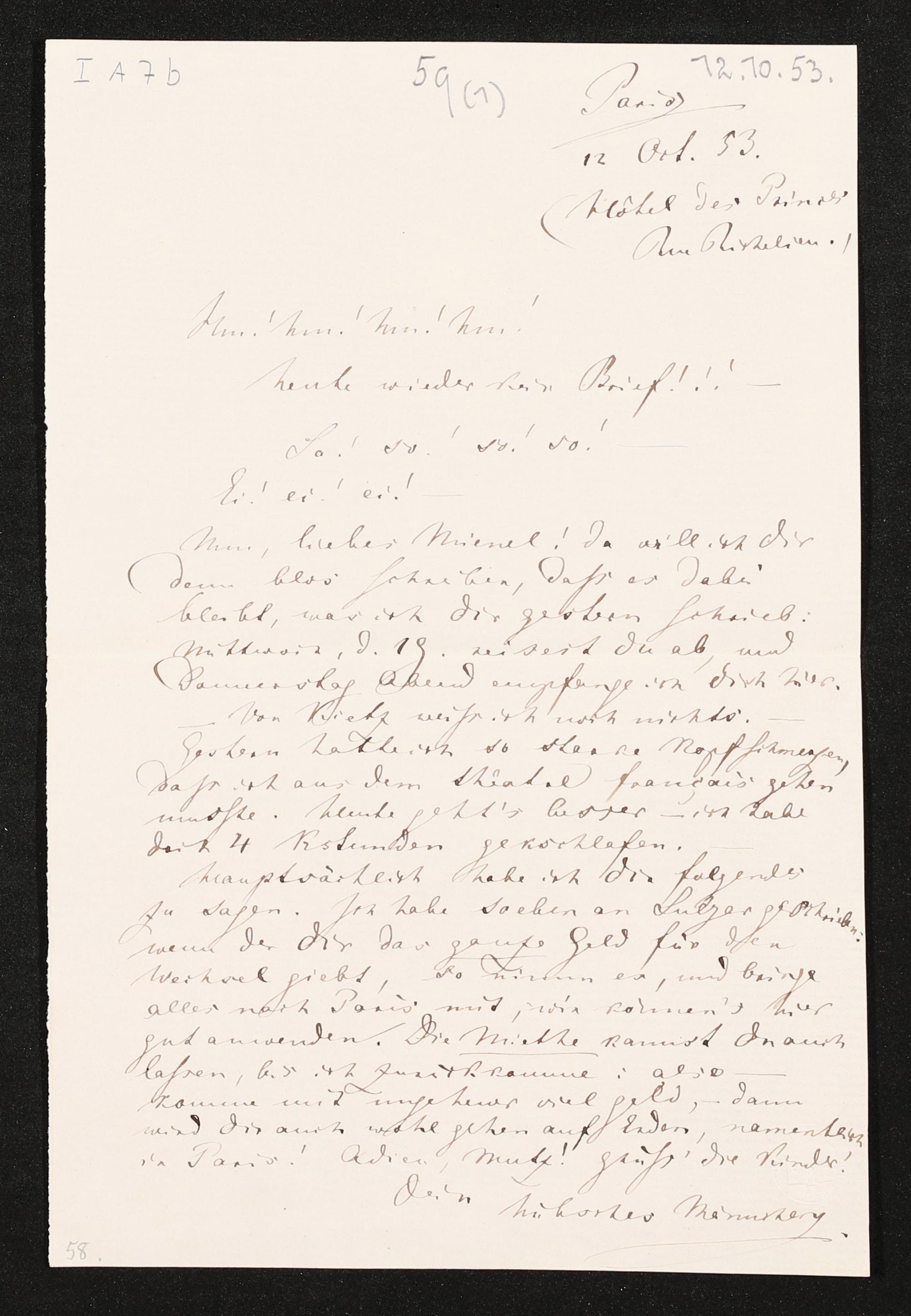 eigenhändiger Brief von Richard Wagner an Minna Wagner