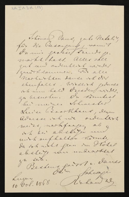 eigenhändiger Brief von Richard Wagner an Natalie Planer