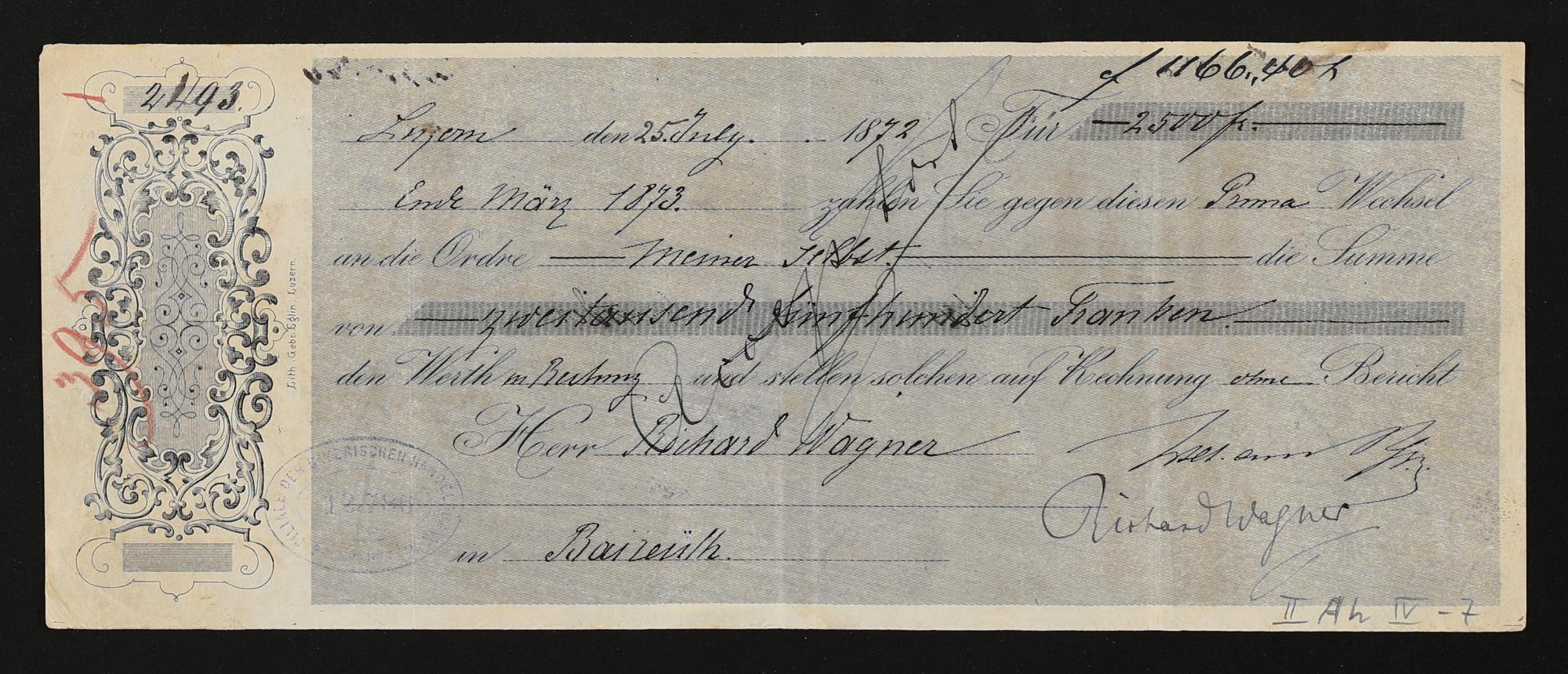 Wechsel für Richard Wagner, ausgestellt bei der Eidgenössischen Bank Luzern