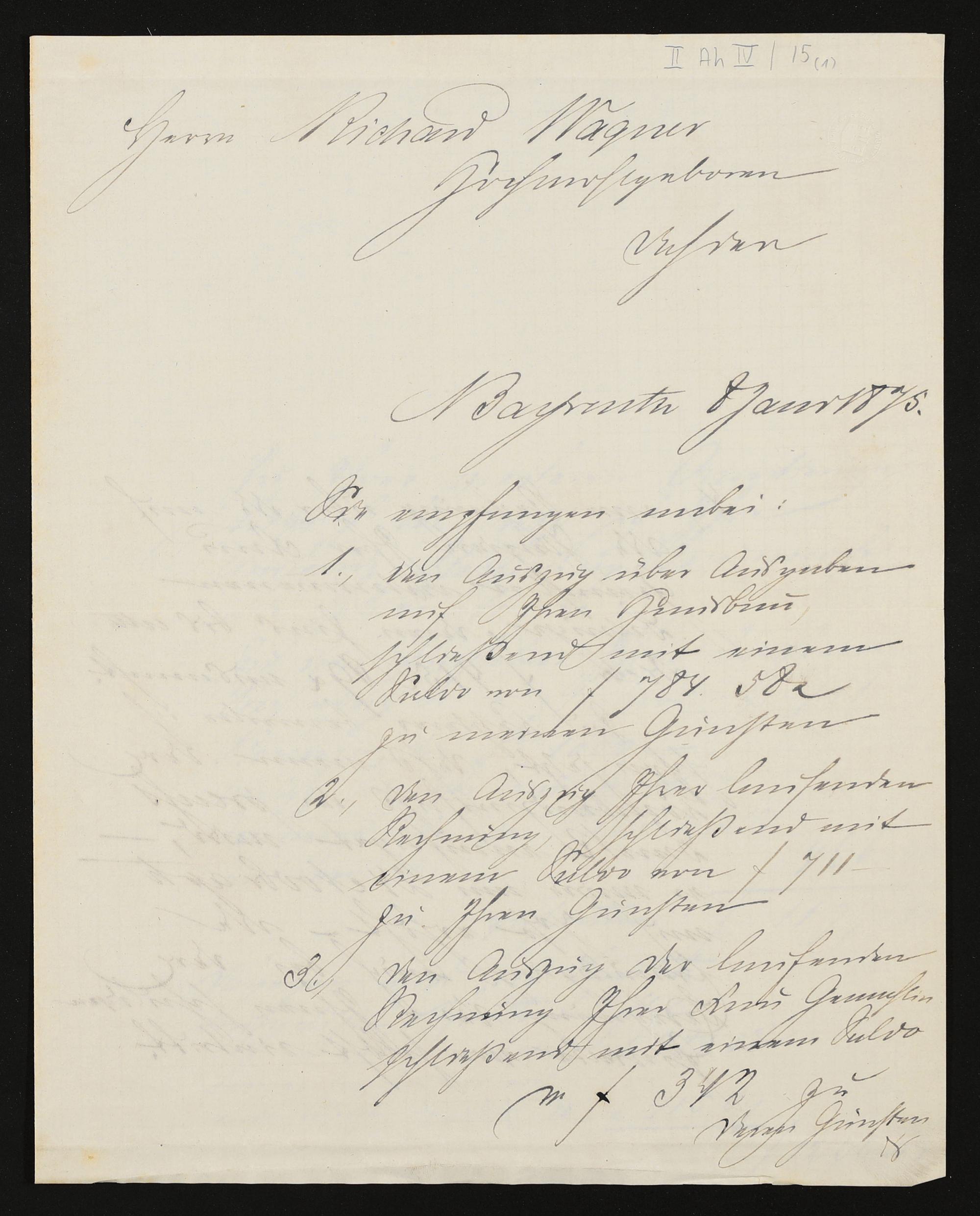 eigenhändiger Brief von Friedrich Feustel an Richard Wagner