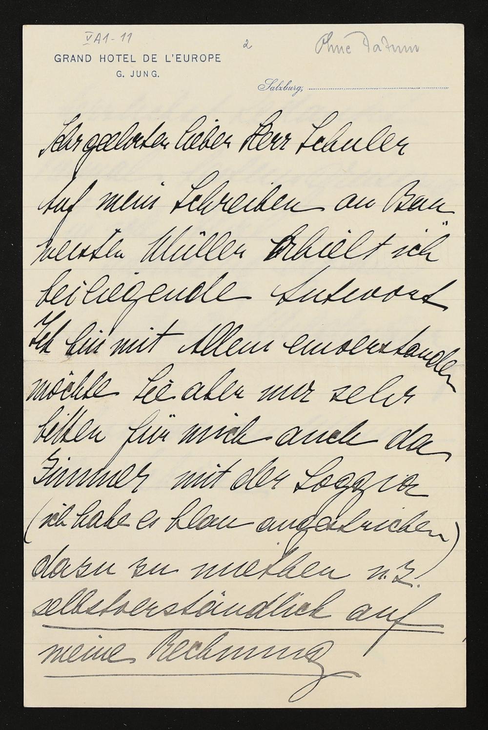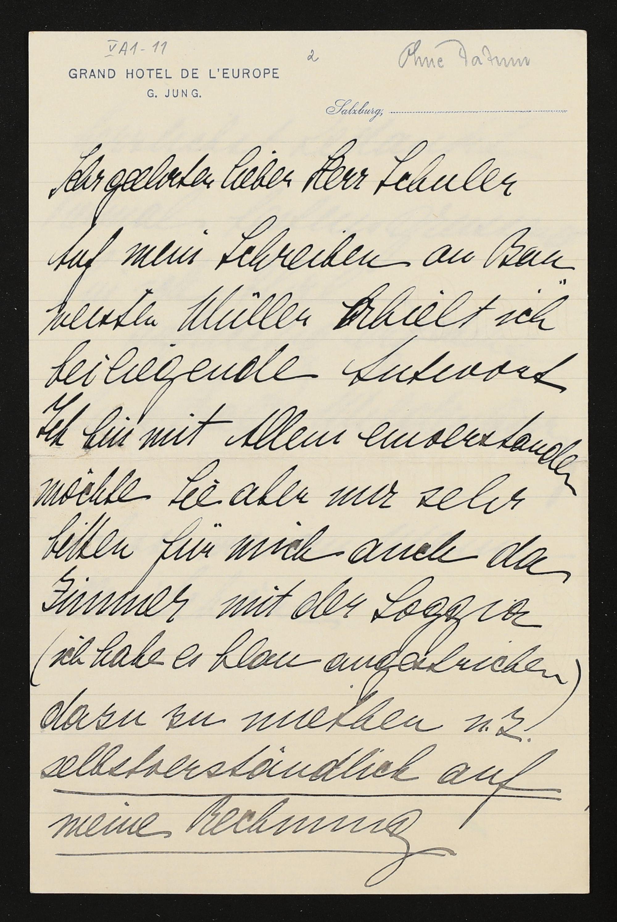 eigenhändiger Brief von Anna Bahr-Mildenburg an Friedrich Wilhelm Schuler
