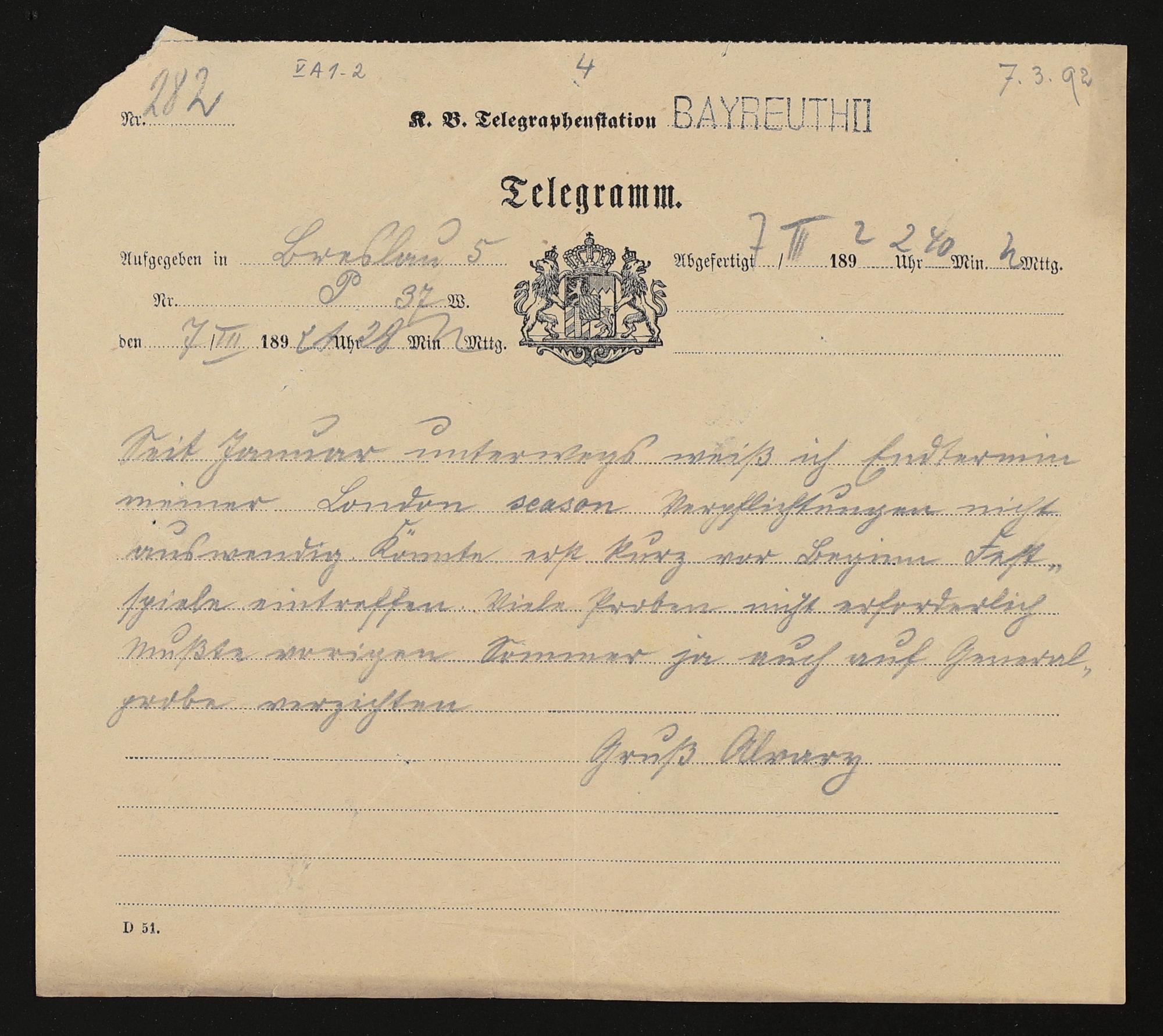 Telegramm von Max Alvary an Adolf von Gross