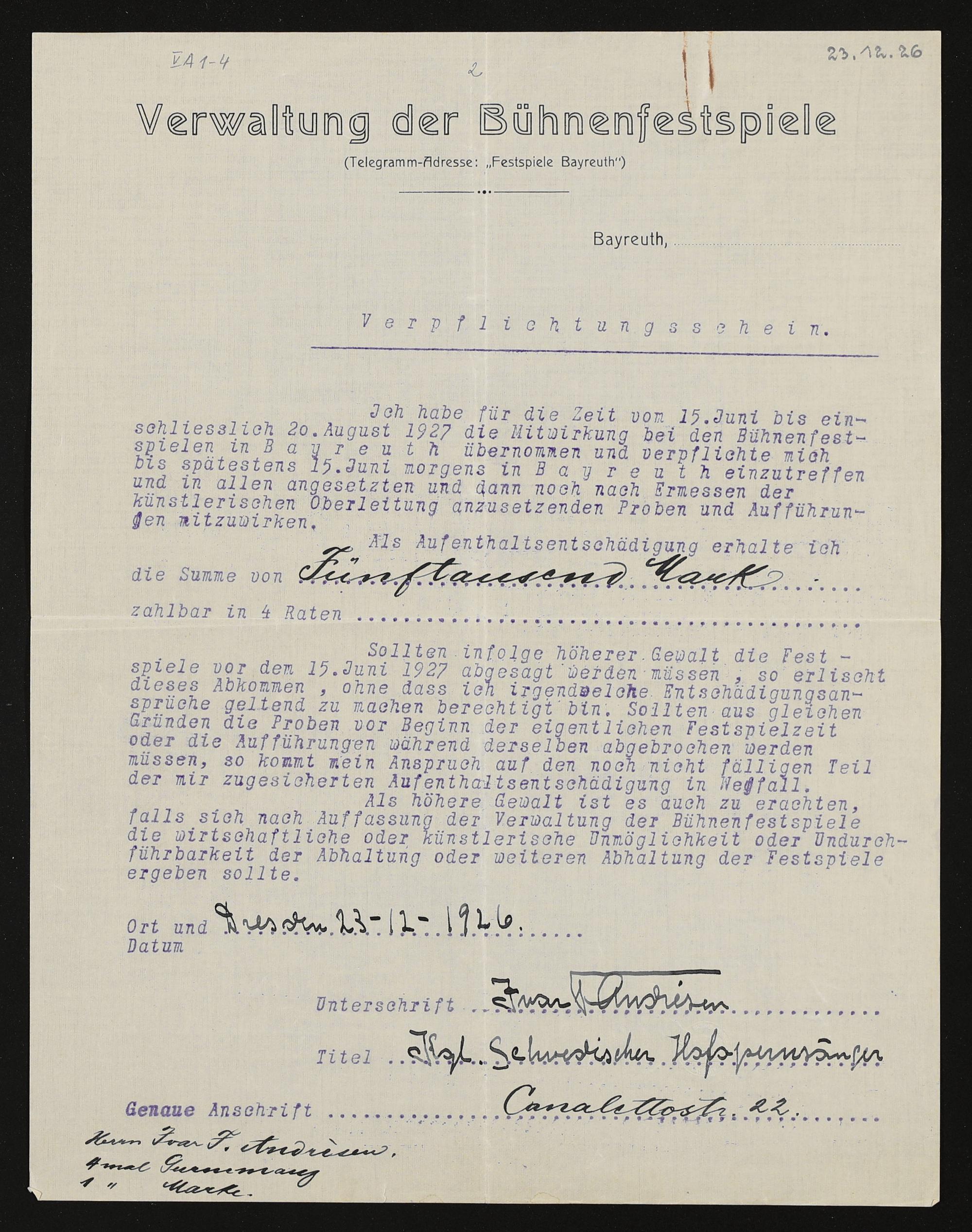 Verpflichtungsschein mit eigenhändigen Eintragungen von Ivar Frithjof Andrésen an die Verwaltung der Bühnenfestspiele
