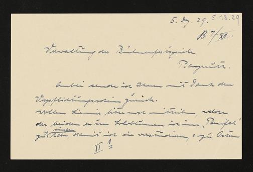 eigenhändige Briefkarte von Erna Berger an die Verwaltung der Bühnenfestspiele