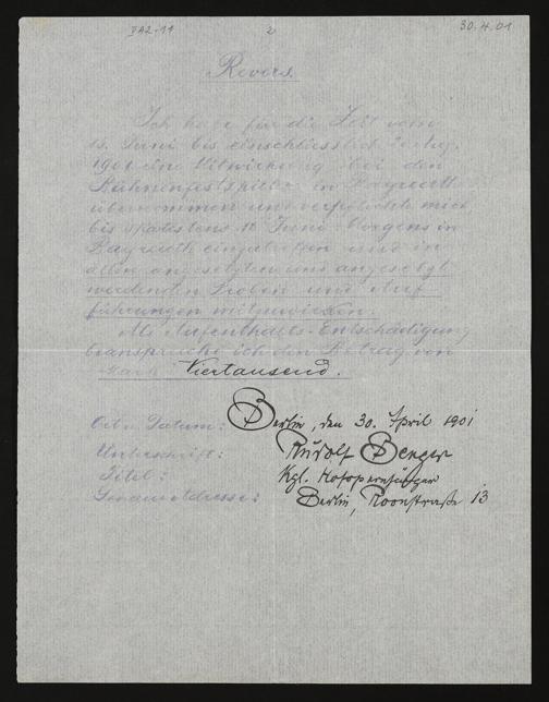 Revers mit eigenhändigen Eintragungen von Rudolf Berger an die Verwaltung der Bühnenfestspiele