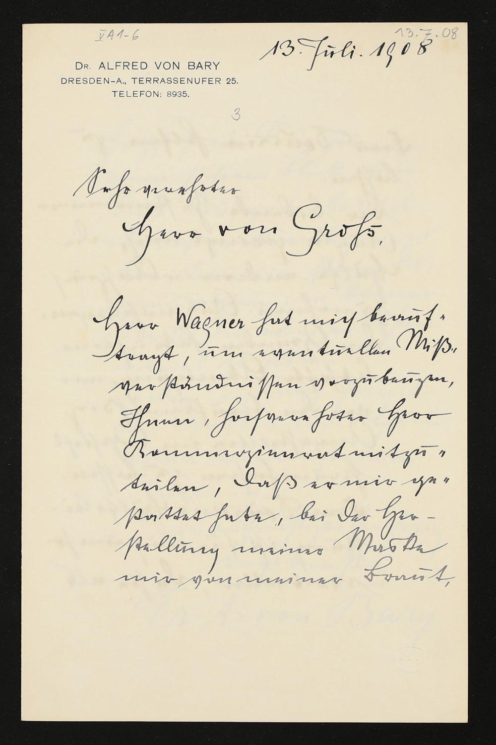 eigenhändiger Brief von Alfred von Bary an Adolf von Gross