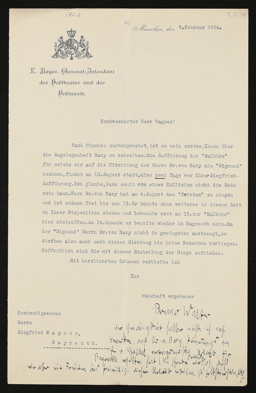 maschinenschriftlicher Brief von Bruno Walter an Siegfried Wagner, handschriftliche Zeilen von Siegfried Wagner an die Verwaltung der Bühnenfestspiele