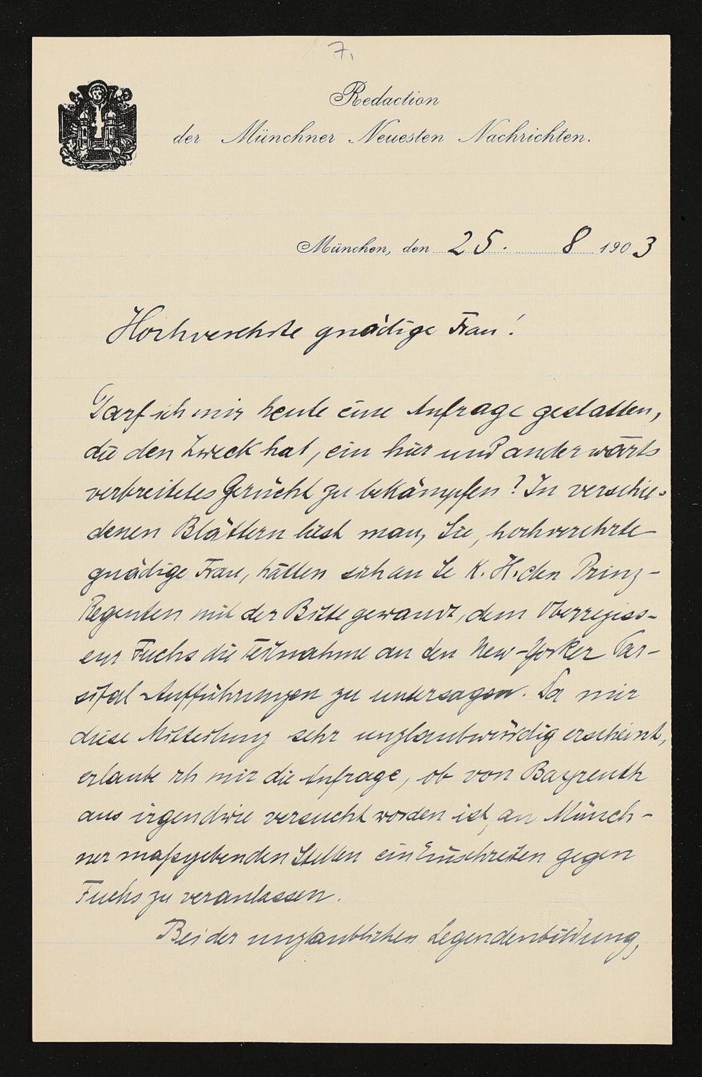 eigenhändiger Brief von W. P. Busching (Redaktion Münchner Neueste Nachrichten) an Cosima Wagner