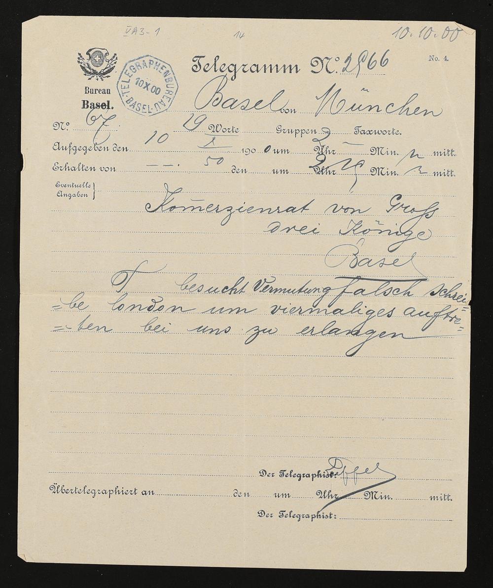 Telegramm von einem unbekannten Absender an Adolf von Gross