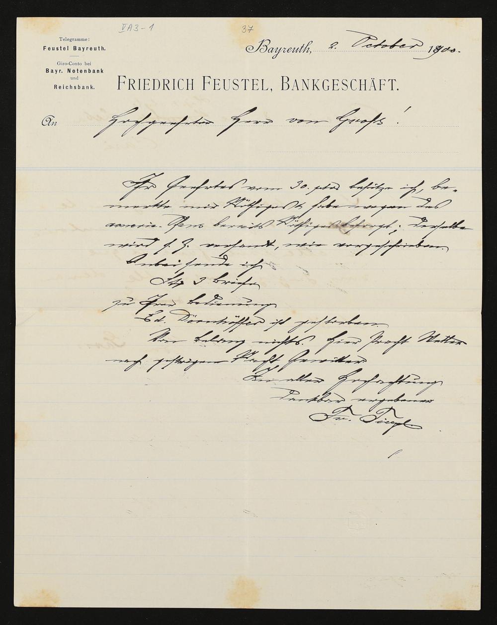 eigenhändiger Brief von Friedrich Feustel an Adolf von Gross, eigenhändige Zeilen von Adolf von Gross