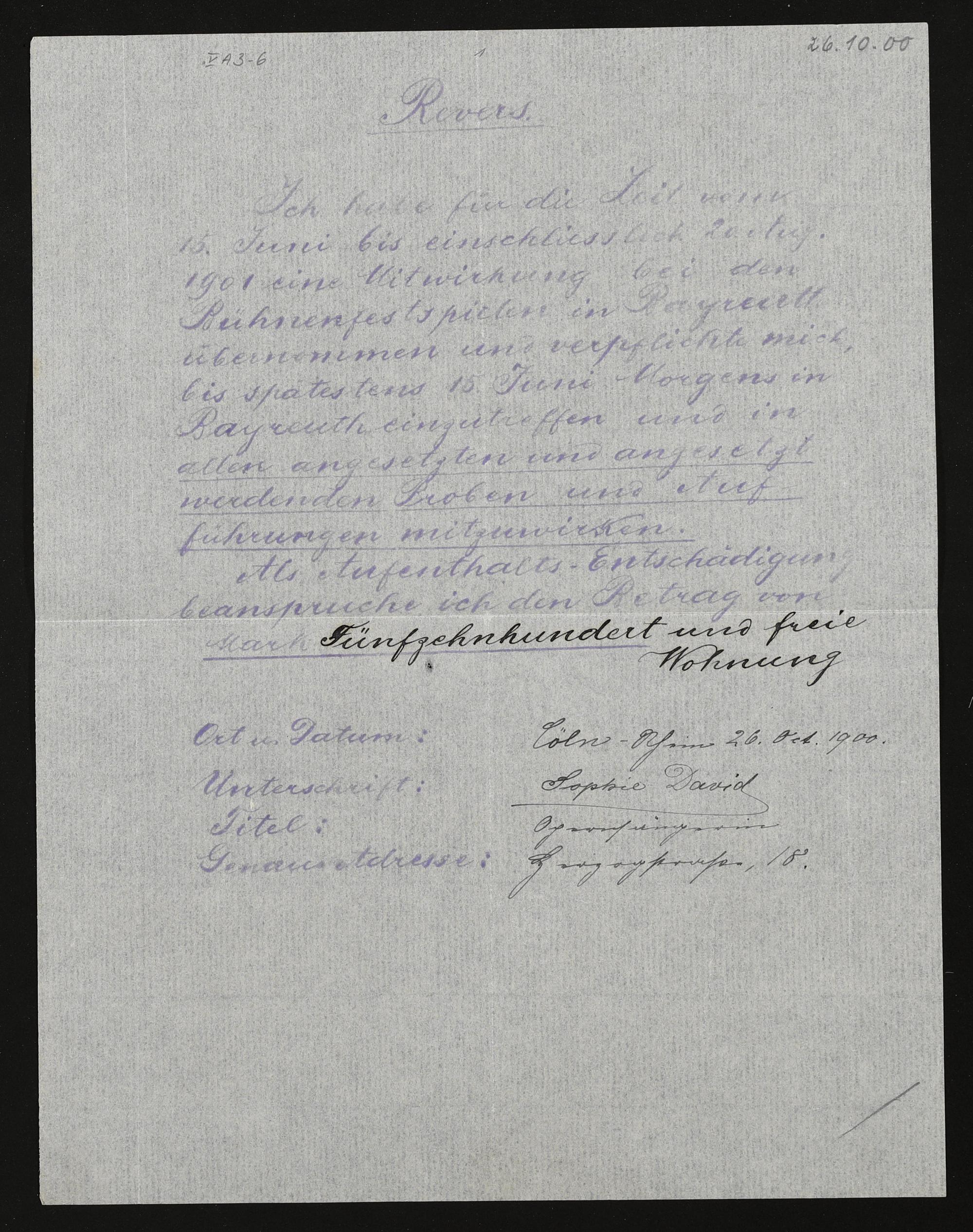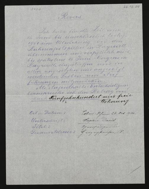 Revers mit eigenhändigen Eintragungen von Sophie David an die Verwaltung der Bühnenfestspiele