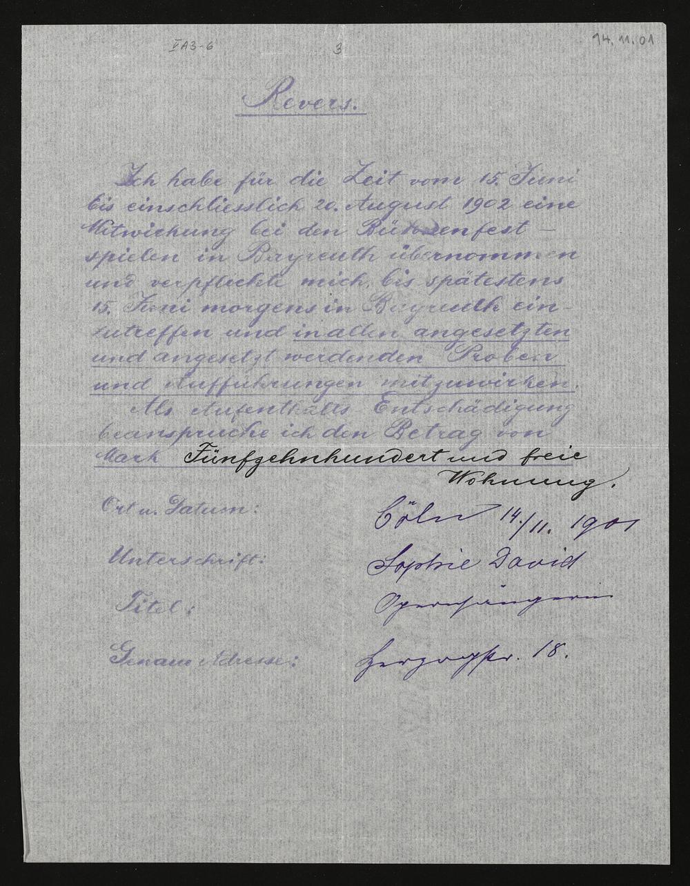 Revers mit eigenhändigen Eintragungen von Sophie David an die Verwaltung der Bühnenfestspiele