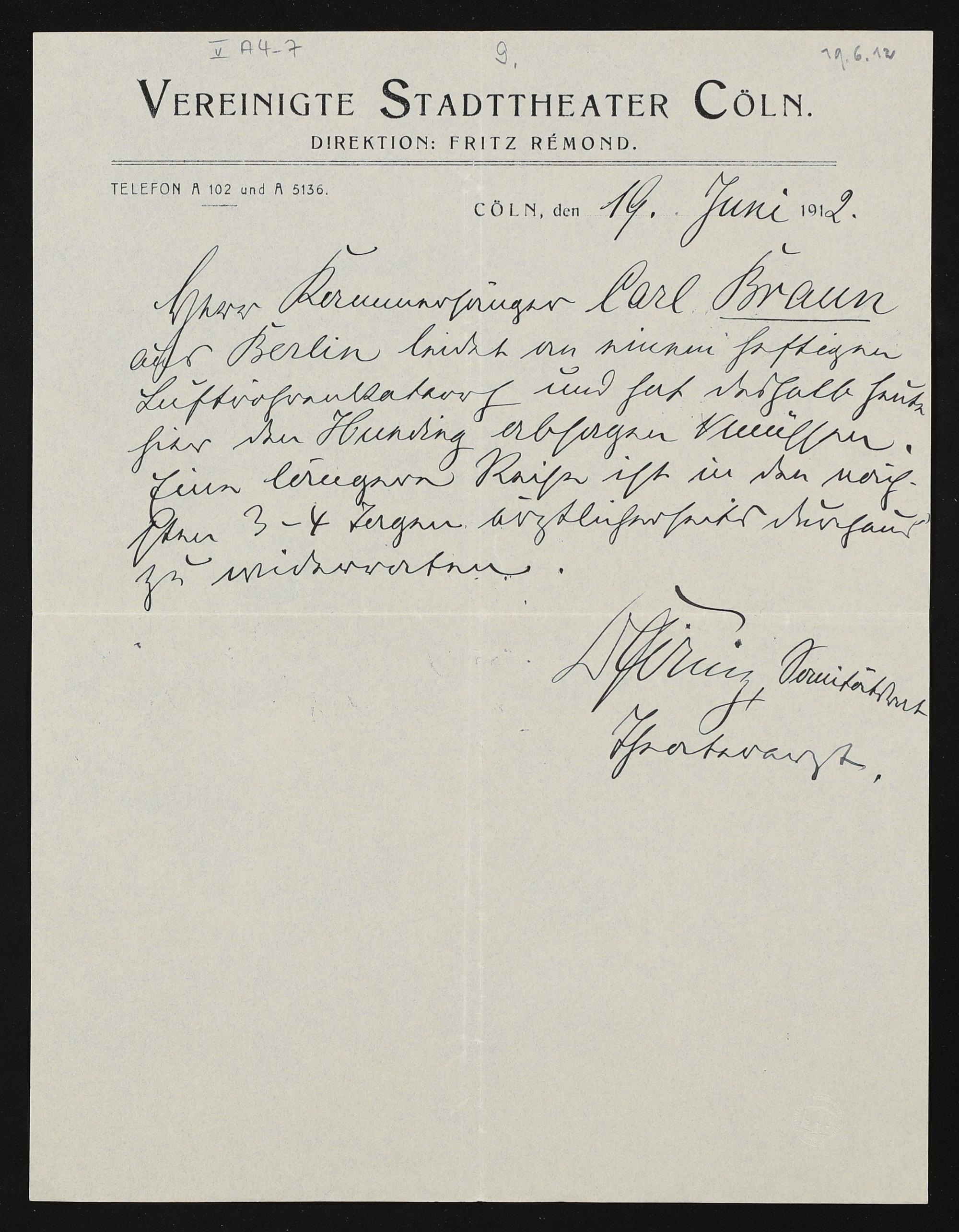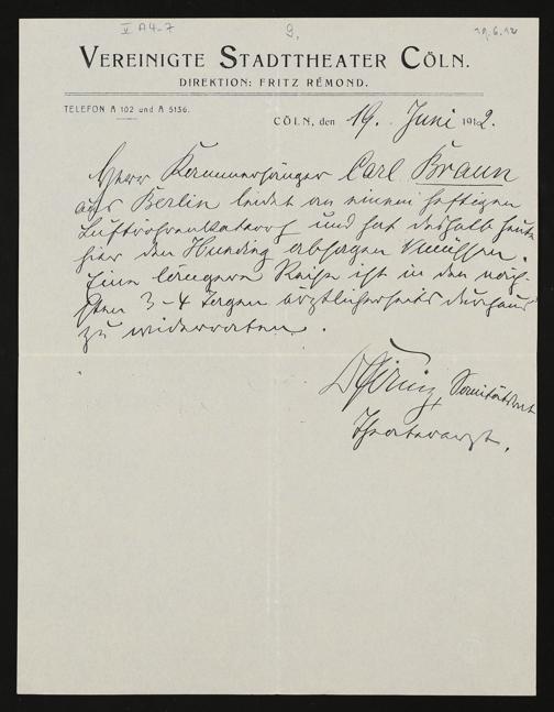 eigenhändiger Brief von einem unbekannten Verfasser (Vereinigte Stadttheater Cöln) an die Festspielverwaltung