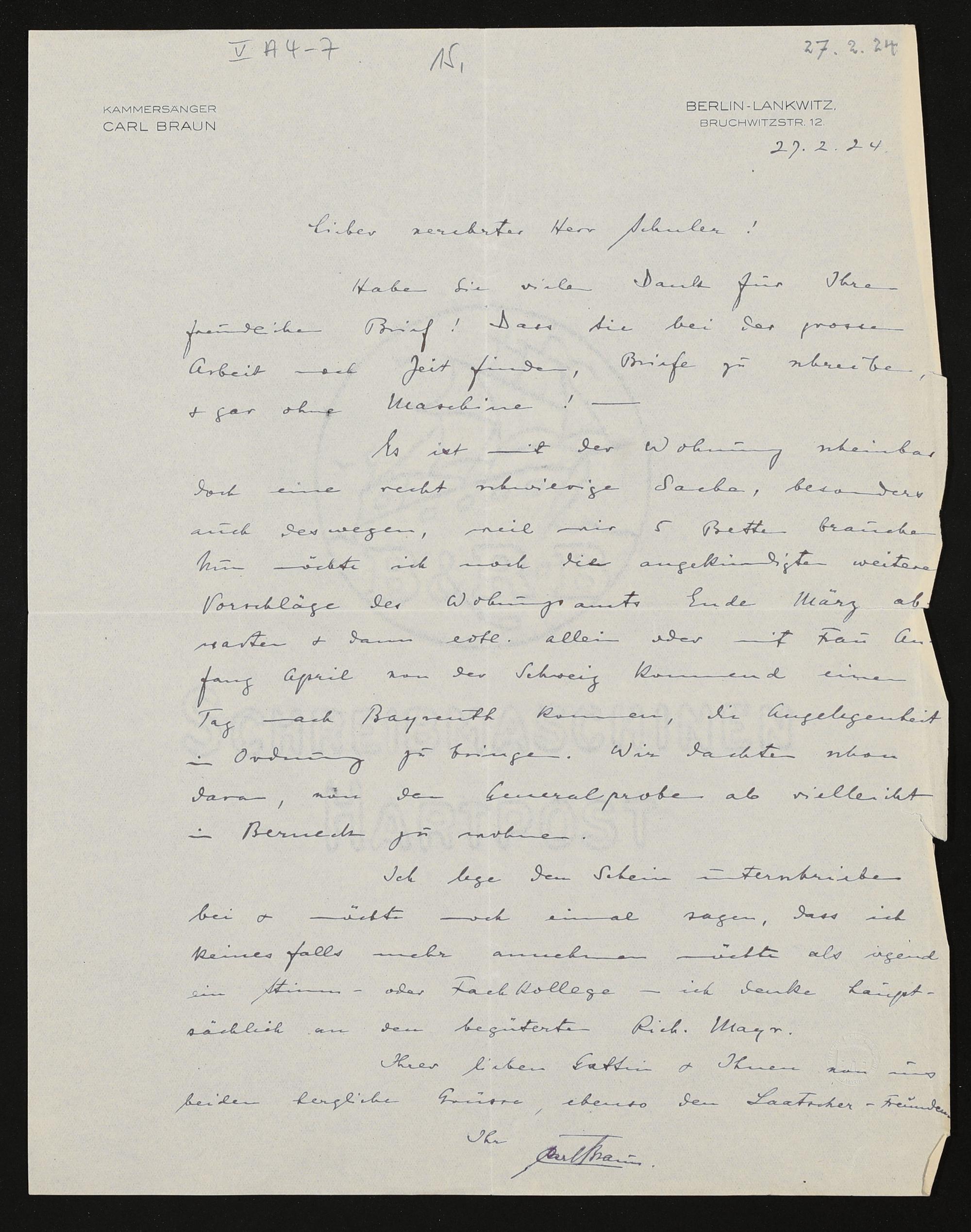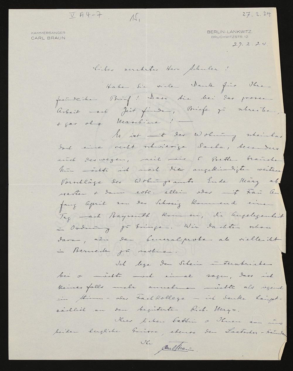 eigenhändiger Brief von Carl Braun an Friedrich Wilhelm Schuler