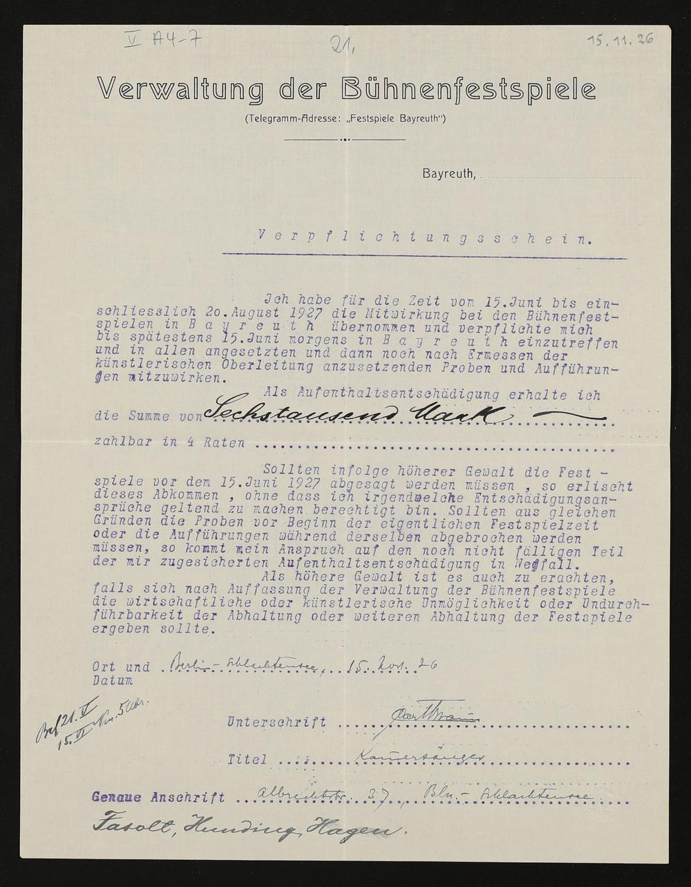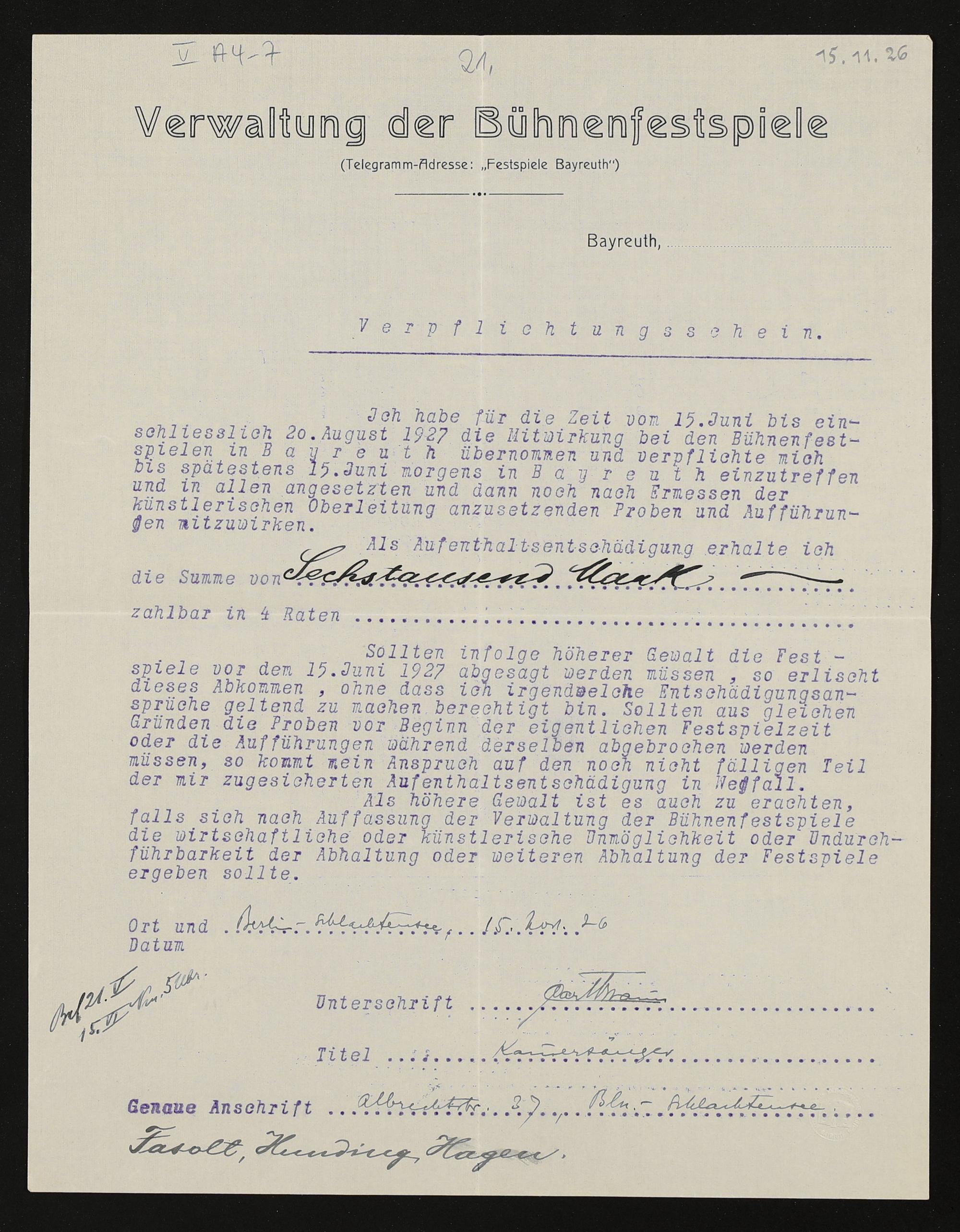 Verpflichtungsschein mit eigenhändigen Eintragungen von Carl Braun an den Verwaltungsrat der Bühnenfestspiele