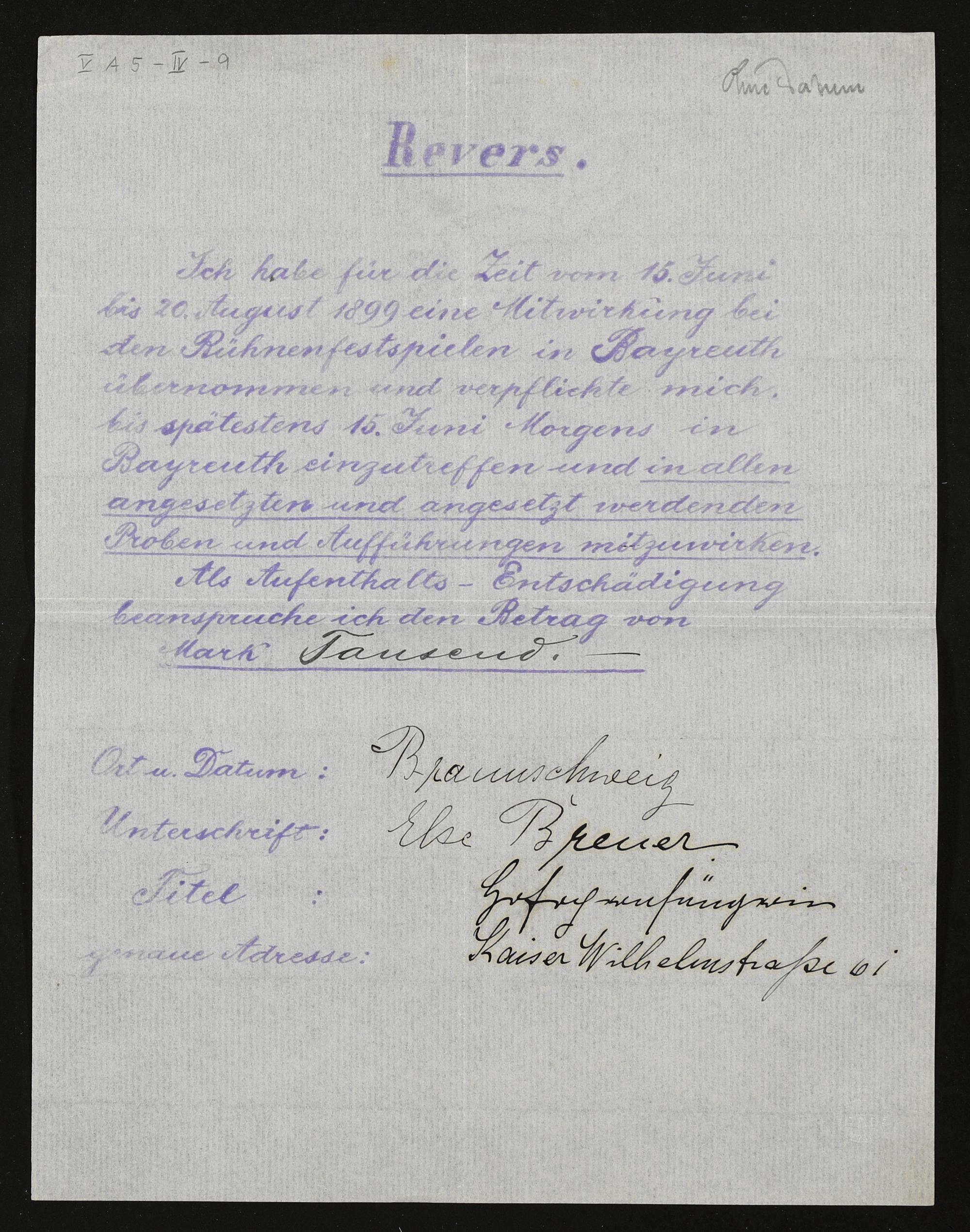 Revers mit eigenhändigen Eintragungen von Else Breuer an die Verwaltung der Bühnenfestspiele