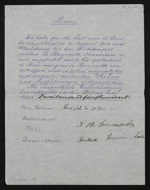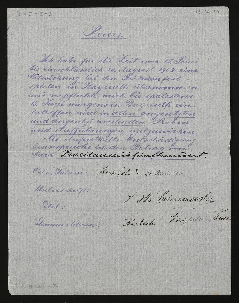 Revers mit eigenhändigen Eintragungen von Otto Briesemeister an die Verwaltung der Bühnenfestspiele