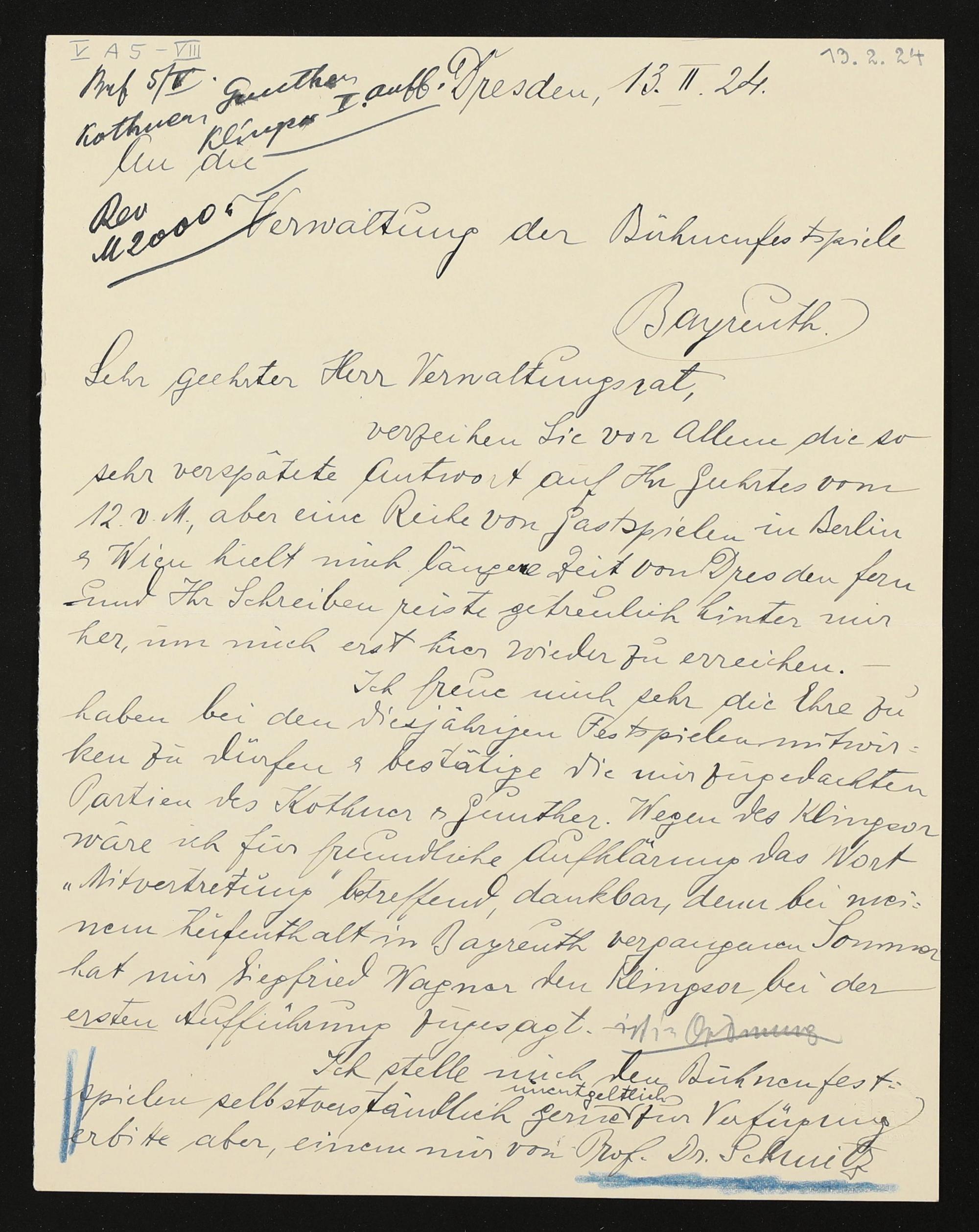 eigenhändiger Brief von Robert Burg an die Verwaltung der Bühnenfestspiele