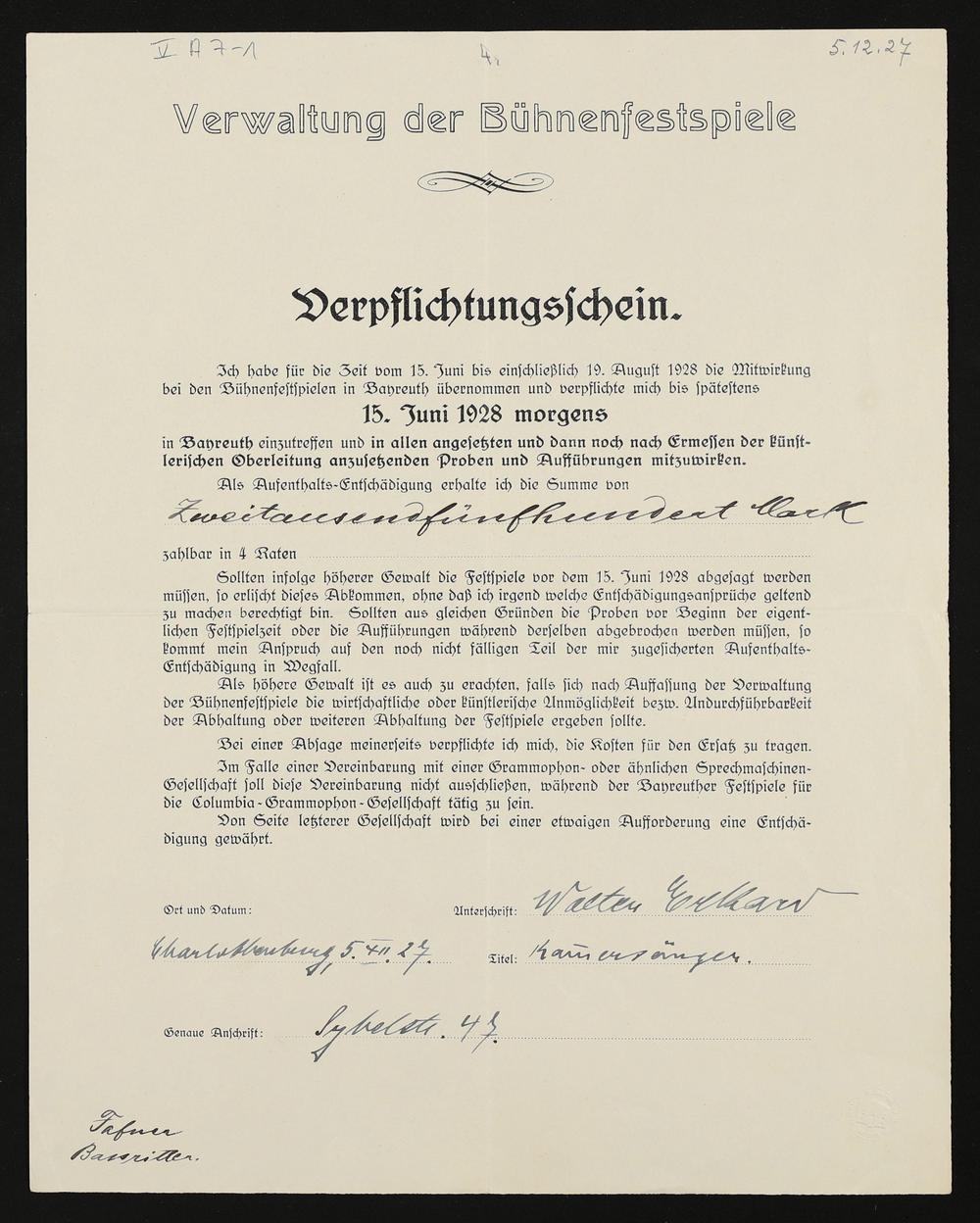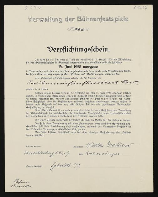 Verpflichtungsschein mit eigenhändigen Eintragungen von Walter Eckard an die Verwaltung der Bühnenfestspiele