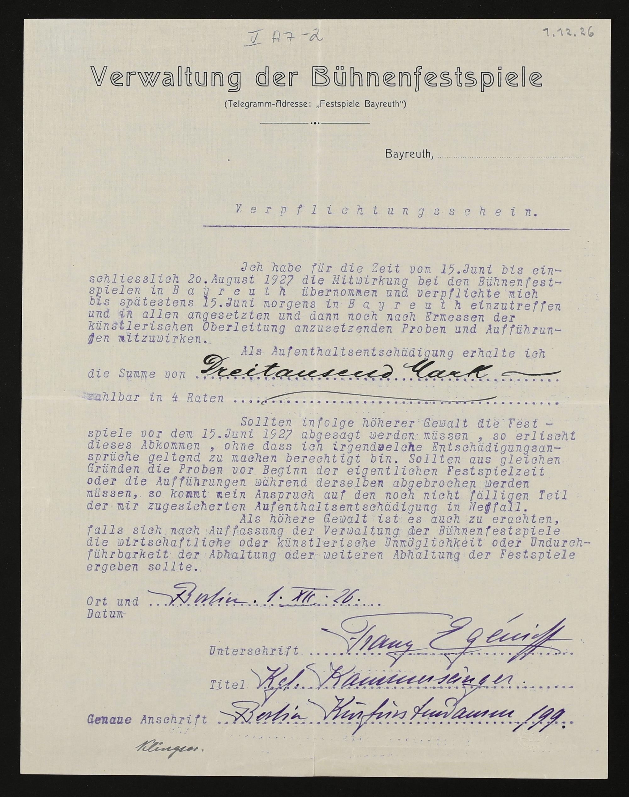 Verpflichtungsschein mit eigenhändigen Eintragungen von Franz Egénieff an die Verwaltung der Bühnenfestspiele