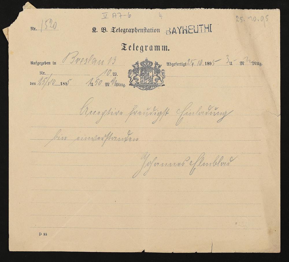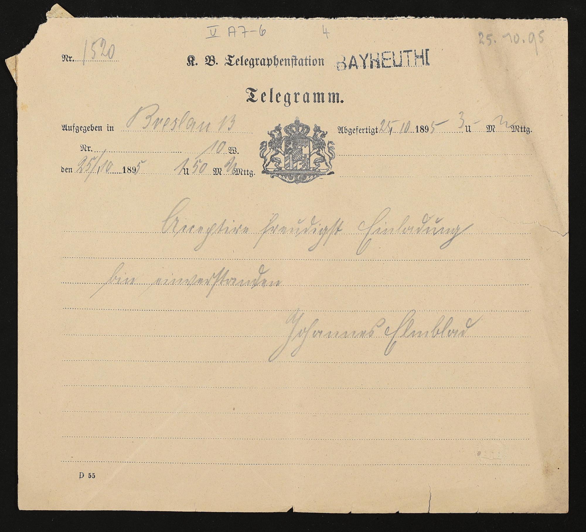 Telegramm von Johannes Elmblad an die Verwaltung der Bühnenfestspiele