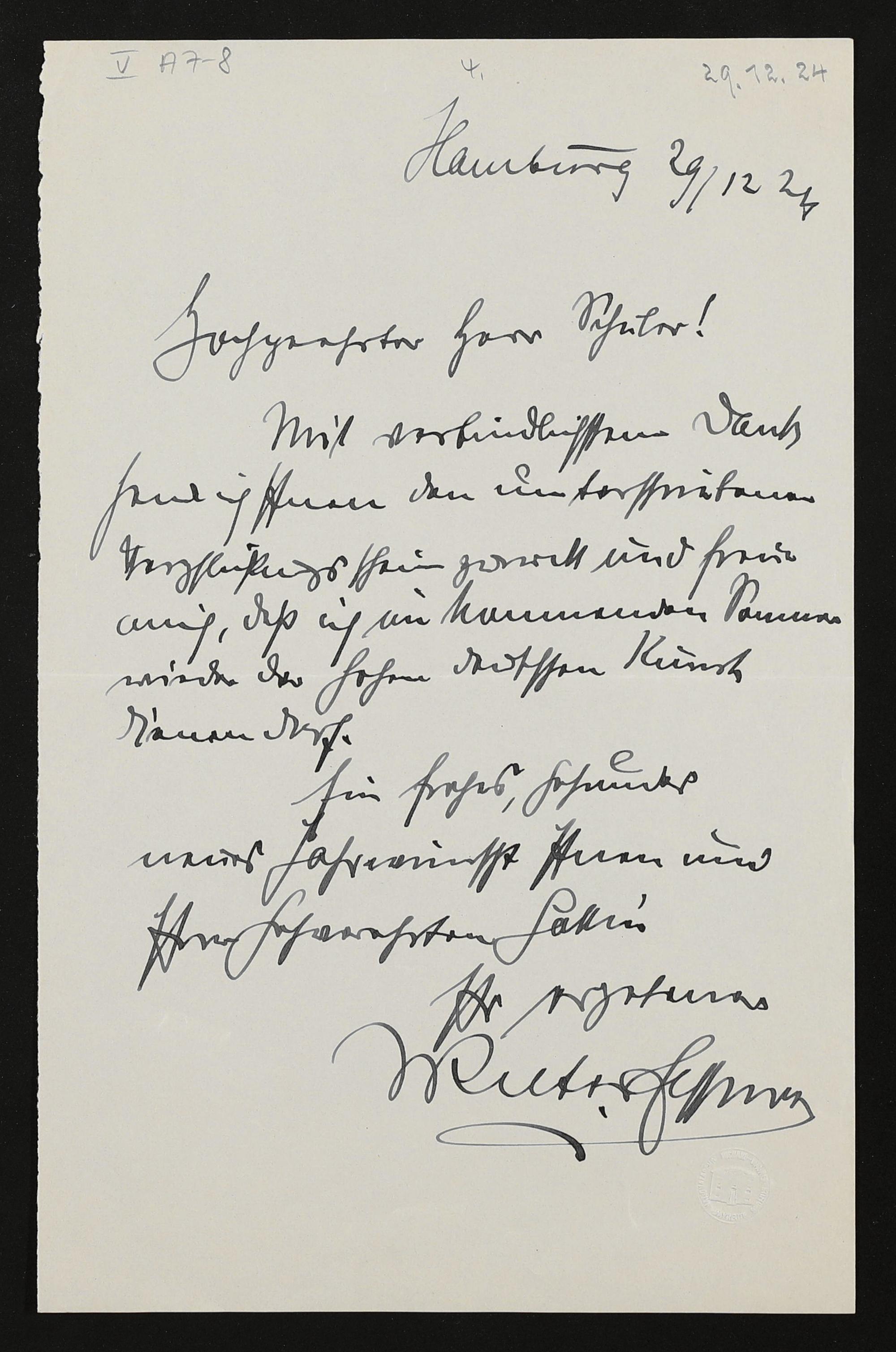 eigenhändiger Brief von Walter Elschner an Friedrich Wilhelm Schuler