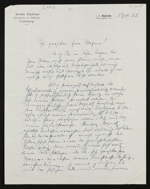 eigenhändiger Brief von Walter Elschner an Siegfried Wagner