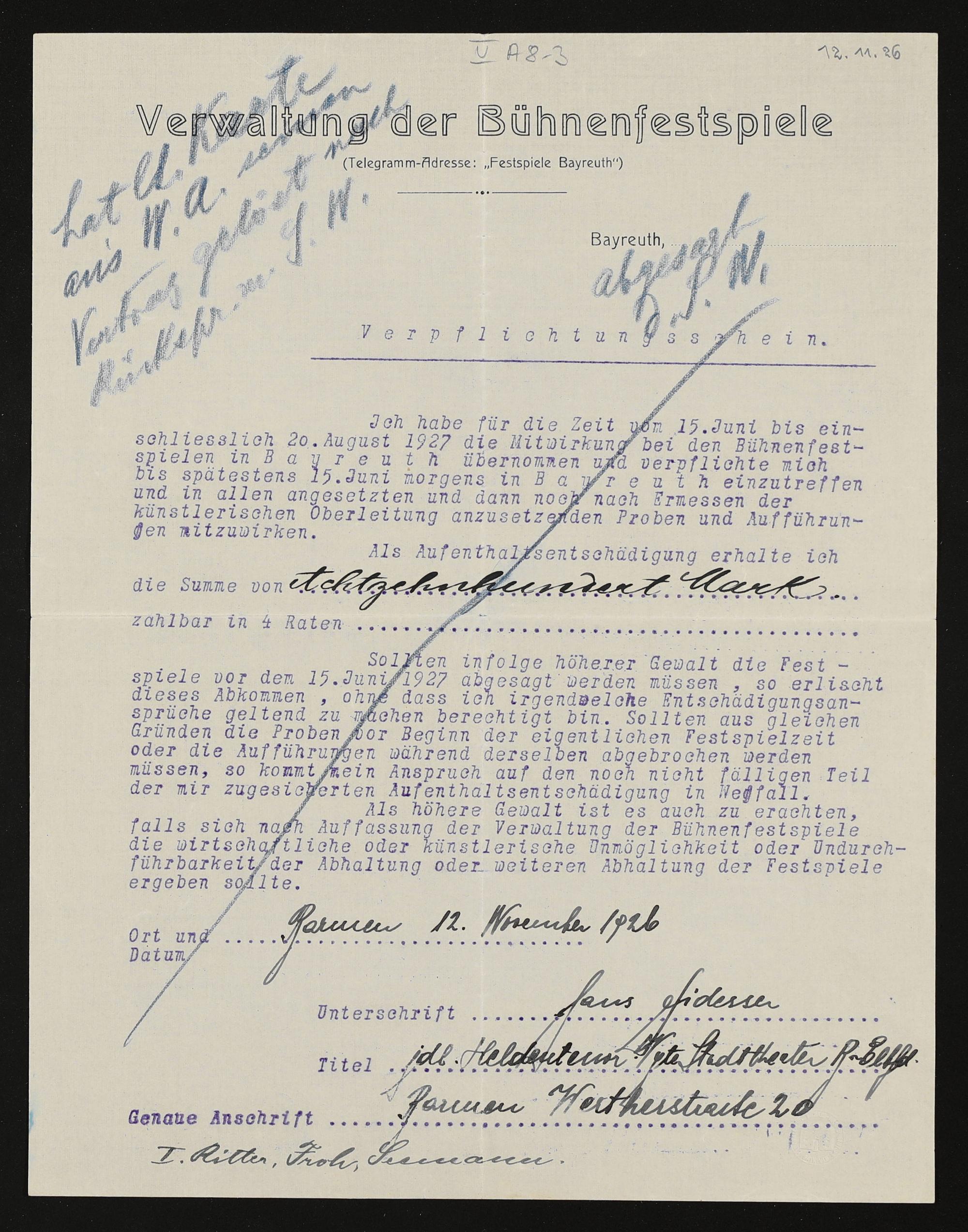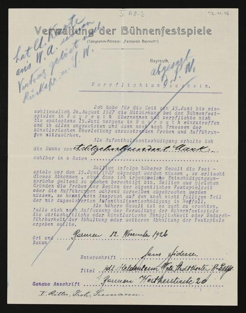 Verpflichtungsschein mit eigenhändigen Eintragungen von Hans Fidesser an die Verwaltung der Bühnenfestspiele