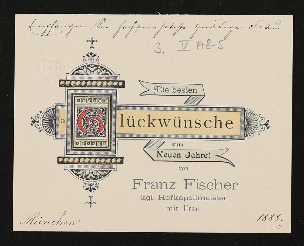 gedruckte Glückwunschkarte mit handschriftliche Zeilen von Franz Fischer an Cosima Wagner