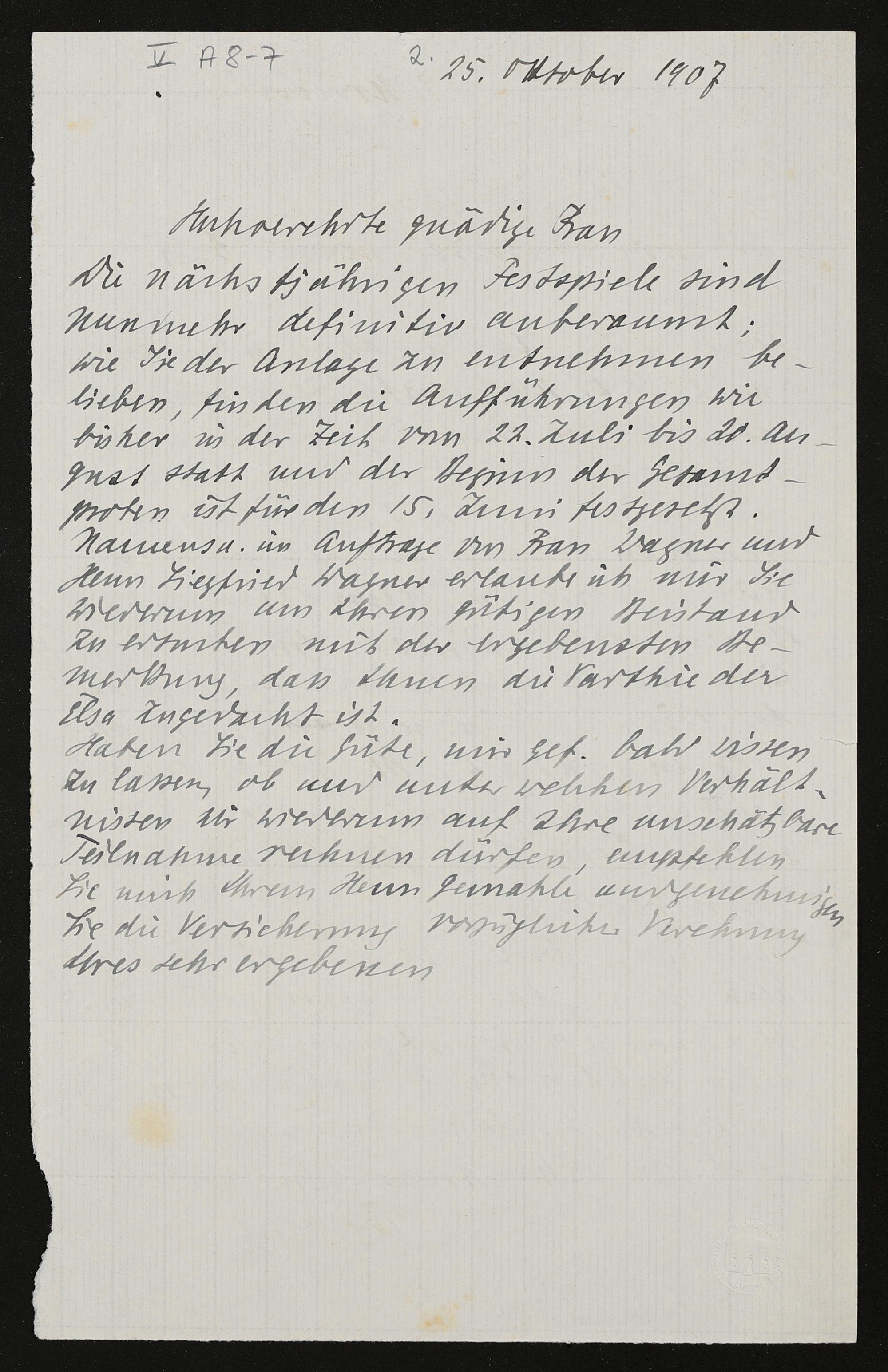 eigenhändiger Brief von Katharina Fleischer-Edel an Cosima Wagner