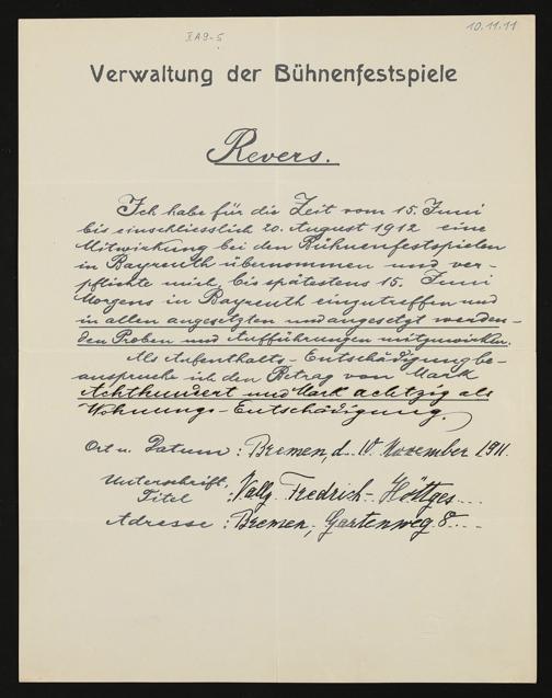 Revers mit eigenhändigen Eintragungen von Vally Fredrich-Höttges an die Verwaltung der Bühnenfestspiele