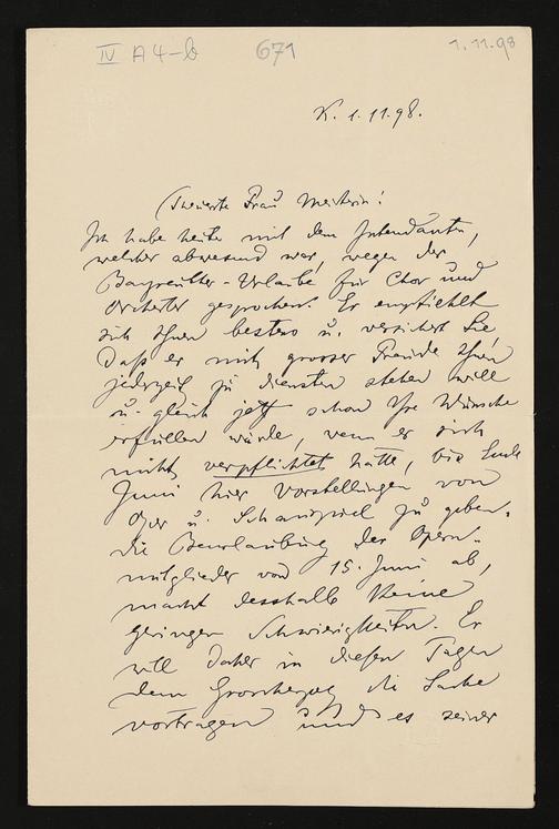 eigenhändiger Brief von Felix Mottl an Cosima Wagner