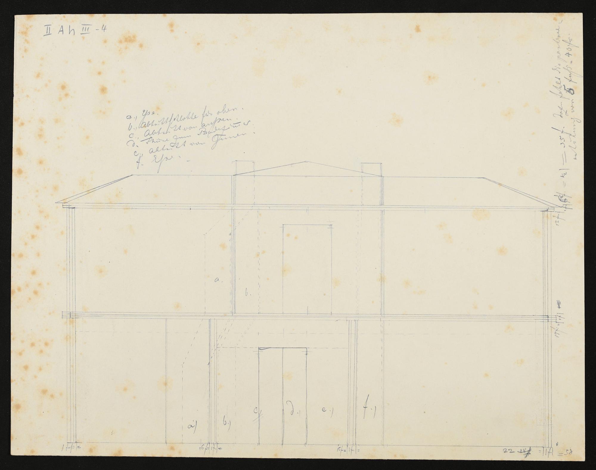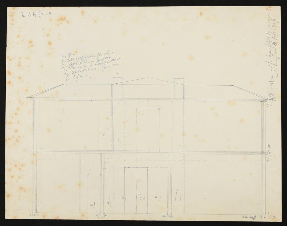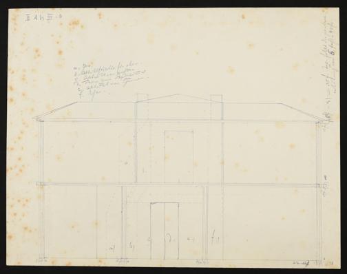 Aufriss von einem in Zürich Zürich geplanten Wohnhaus, eigenhändige Skizze von Richard Wagner mit Anmerkungen. Längsschnitt mit Einzeichnung der Essen und Abtrittschlote